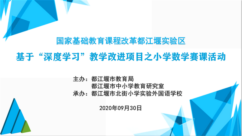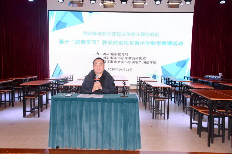 2020年9月28~30日,“国家基础教育课程改革都江堰试验区基于‘深度学习’教学改进项目之小学数学赛课活动”在都江堰市北街小学实验外国语学校如期举行,全市共9位教师代表自己学校参加比赛,全市一至六年级数学教师分三天亲临现场观摩了此次活动。