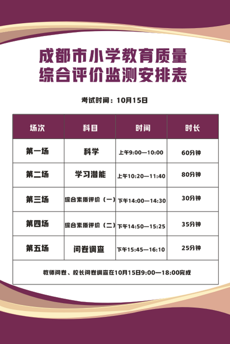 根据成都市教育局统一安排布署,10月15日,按照都江堰市教育局教育质量综合评价监测工作安排,我校作为都江堰市唯一一所被抽测的民办学校,接受成都市2020中小学教育质量综合评价监测,我校已连续三年作为都江堰市民办学校代表接受成都市中小学教育质量综合评价监测。此次教育质量综合评价监测由成都市郫都区驻点督考员进行现场驻点督考,都江堰市蒲阳小学交叉督考,都江堰市教育局进行现场考点巡查。