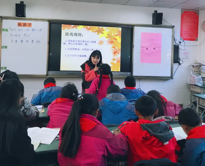 Wang Jun, a Chineseteacher, gave an interesting composition lesson "sticking nose" forchildren of Grade Four.