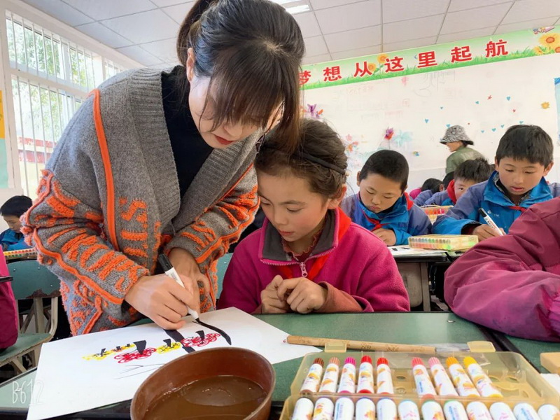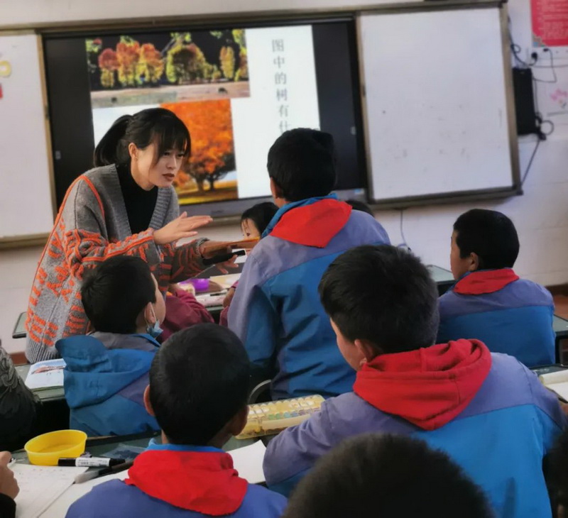 Art teacher Fu Chao brought "goldenautumn of Kangding" to children from of Grade Five.