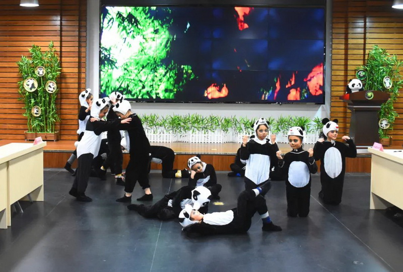 活动开始,我校师生主持闪亮登场,首先由我校舞蹈社团的同学们表演了熊猫音乐课程《熊猫的摇篮》,淋漓尽致地表现了大熊猫憨态可掬的幸福生活。