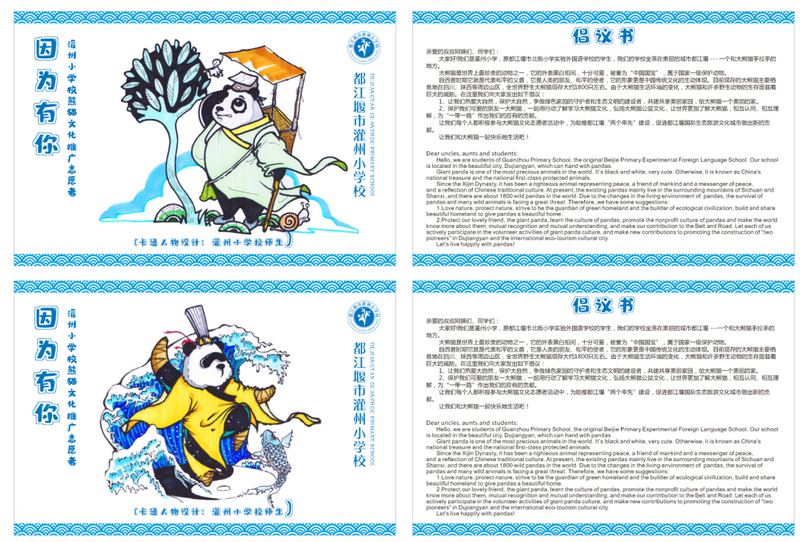 我校大熊猫文化自愿者小分队成员向全市小朋友和叔叔阿姨发出“因为有你”的倡议书,号召大家积极参与到大熊猫保护中来。