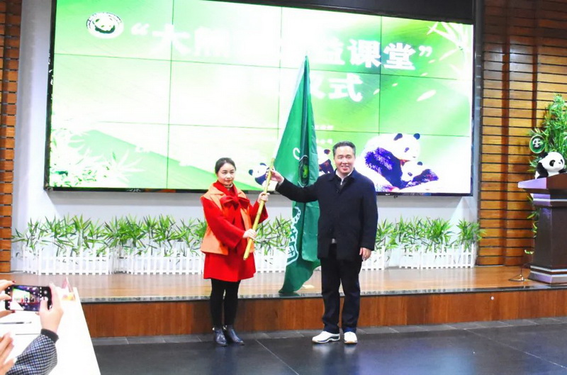 Liu Weiping, deputy director of theChina Giant Panda Conservation and Research Center, presented the flag to ourschool's panda culture volunteers.