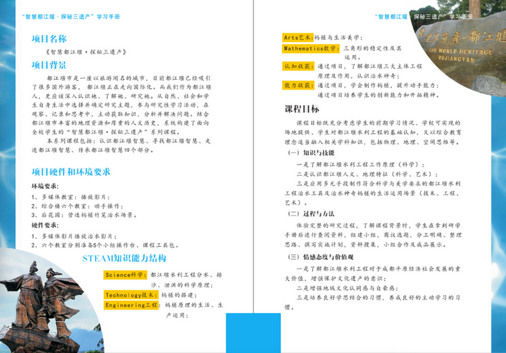 为落实都江堰市国家基础教育课程改革试验区建设,培养学生的创新精神和实践能力,助推学生的未来发展,我校积极利用区域资源,结合都江堰市丰富的地理资源和厚重的人文历史,系统构建了面向全校学生的“智慧都江堰·探秘三遗产”steam课程。