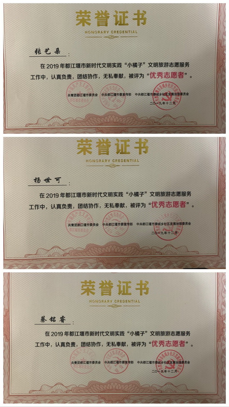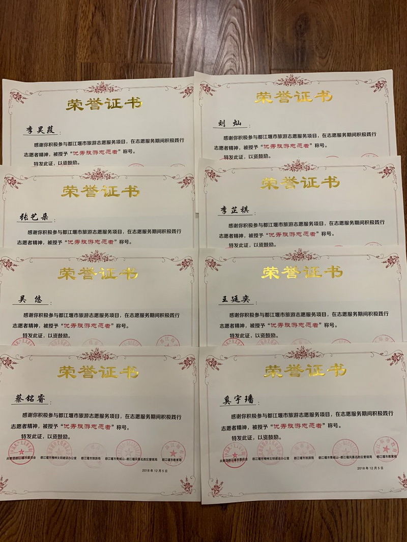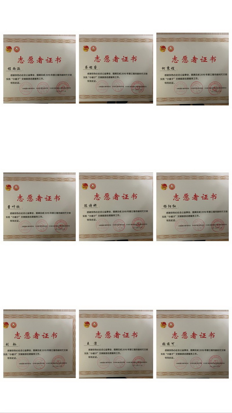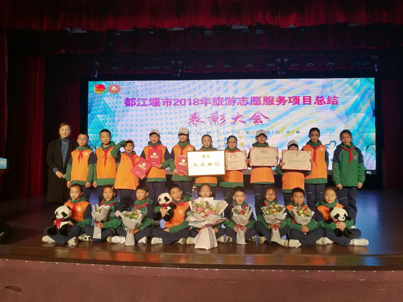 自共青团都江堰市委成立第一批都江堰市旅游志愿者起,陆续有近80名同学入选市旅游志愿者。学校连续4年获得市旅游志愿者先进单位,1人获得“中华小导游”称号,3人获都江堰市“金牌小导游”,2名获市十佳旅游志愿者,19名获市“优秀旅游志愿者”称号。 Since the Communist YouthLeague Dujiangyan Municipal Party Committee established the first batch ofDujiangyan City Tourism Volunteers, nearly 80 students have been selected asCity Tourism Volunteers. The school has been awarded as an advanced unit ofmunicipal tourism volunteers for 4 consecutive years. 1 person was awarded thetitle of "Little Chinese Tour Guide", 3 persons were awarded the"Gold Medal Little Tour Guide" of Dujiangyan City, 2 persons wereawarded the City Top Ten Tourist Volunteers, and 19 persons were awarded theCity "Excellent Tour Volunteer" title.