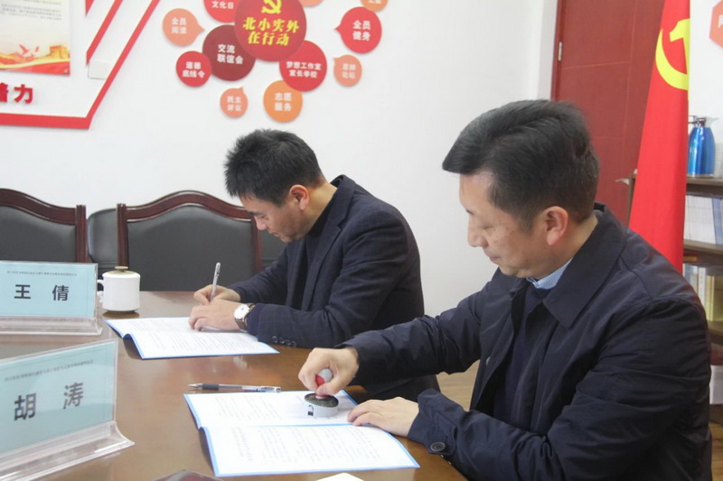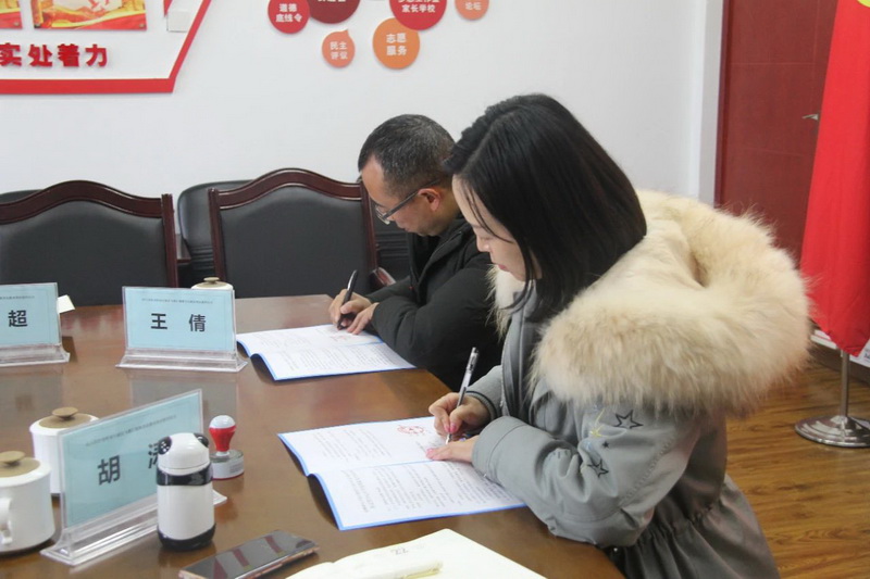 吴雨珂校长和耿达镇中心小学校校长王超签约文件Signing documents between President Wu and President Wang