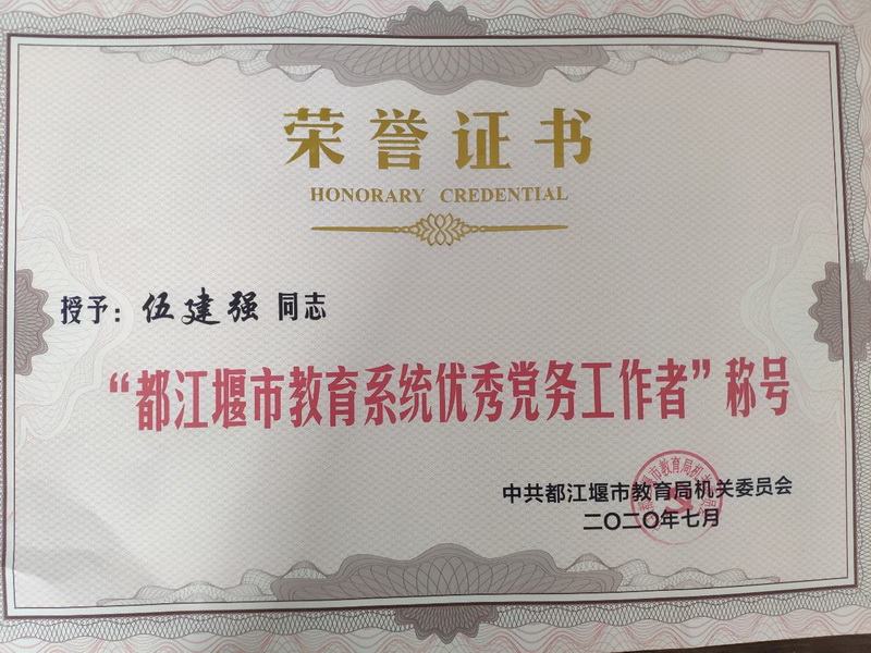 为表扬先进、鲜明导向,激励全市各级党组织和广大党员干部更好地发挥战斗堡垒和先锋模范作用,以优异的成绩向建党100周年献礼,近日,都江堰市市委下发《关于表扬2020年度全市党建工作先进集体和先进个人的通报》,我校党支部荣获都江堰市基层组织建设工作先进集体。
