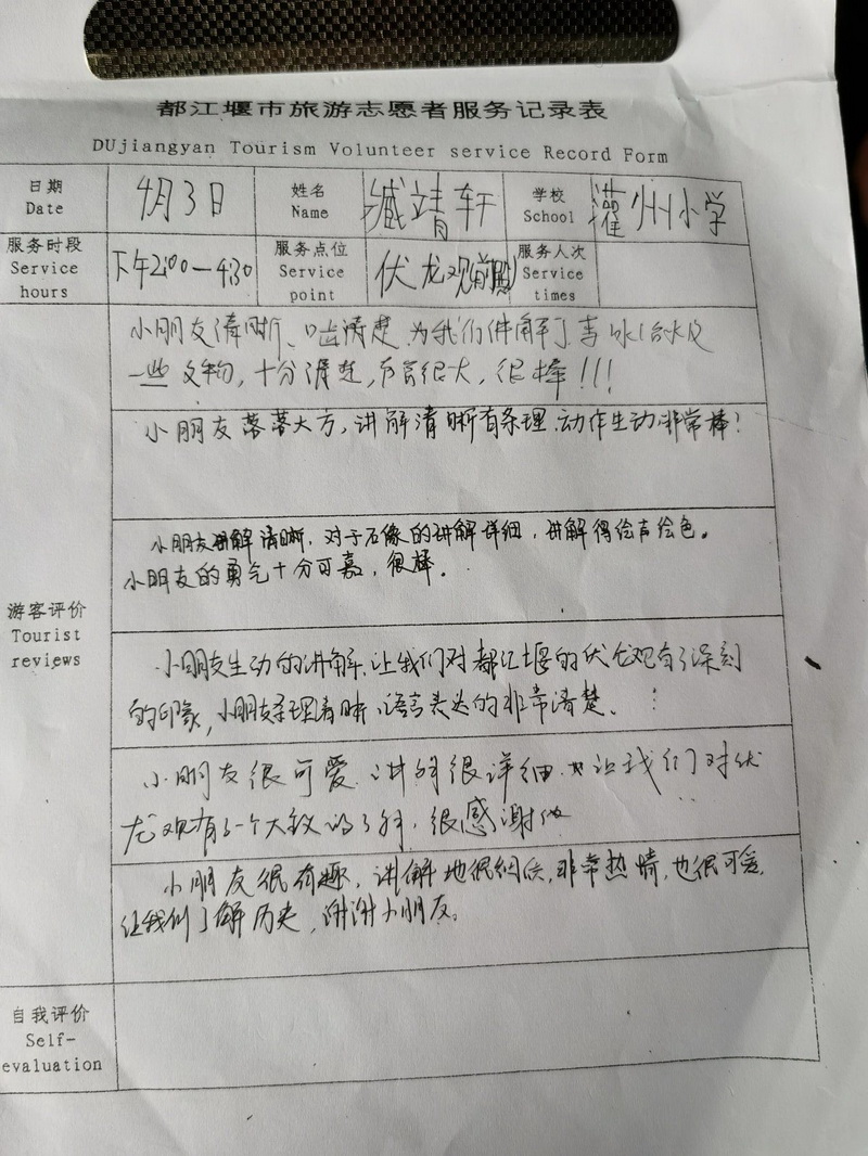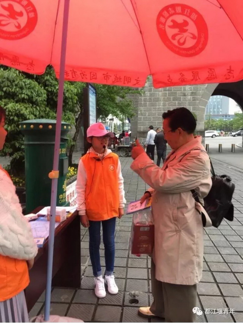 On March 31, Ren Na, deputy secretary of Chengdu Municipal Committee, Chen Douyue, deputy secretary of Party Branch of Chengdu Youth Volunteer Service Center, Luo Ling, Dujiangyan Municipal Committee and the Chairman of All-Dujiangyan Federation of Trade Unions, Wang Yubing, deputy secretary of Dujiangyan Municipal Committee, Liu Shuai, director of Youth Education Office of Dujiangyan Municipal Committee, Zhou Xia, minister of Volunteer Work Department of the Communist Youth League Committee and Liu Jiangmei, staff of the Dujiangyan Municipal Committee Office, accompanied Han Chunli, chief reporter of the Chinese Communist Youth League magazine, to our school to investigate Dujiangyan's "all-around and all-time" Youth Volunteer Service Tourism volunteer service.