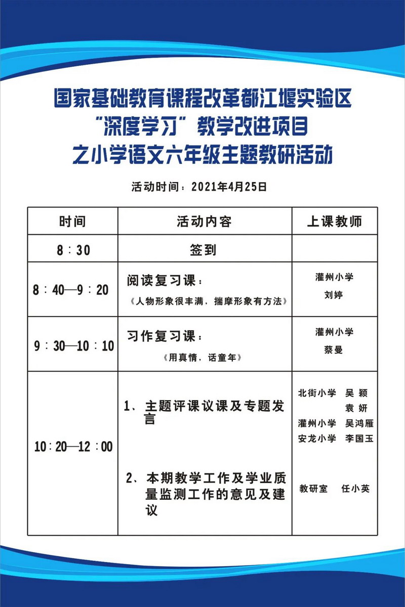 On the morning of April 25, 2021, the sixth grade Chinese teaching and research activity based on "Deep learning" teaching reform project in Dujiangyan Experimental Zone of national basic education curriculum reform, sponsored by the Education Research Office of Dujiangyan primary and secondary schools, was held in our school.