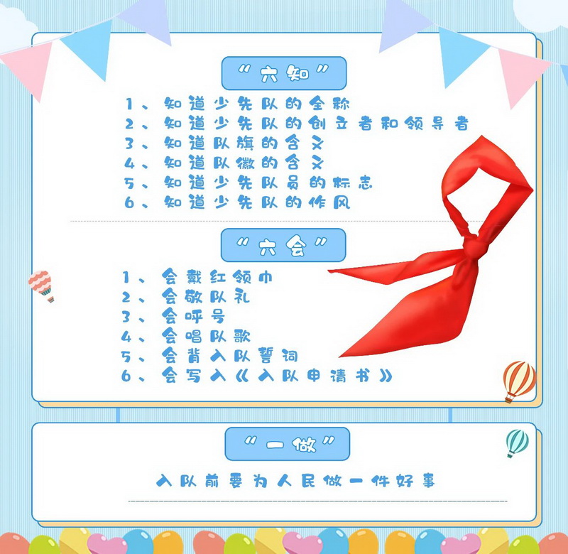 Q4、凡是6周岁到14周岁的少年儿童,愿意加入中国少年先锋队,愿意遵守《中国少年先锋队章程》,就可以向所在学校少先队组织提出入队申请。经过充分的队前教育,在掌握“六知”“六会”,完成“一做”的入队基本标准的基础上,通过自评、互评、他评的方式,达到学校入队评价标准后,经组织批准,就可以入队。
