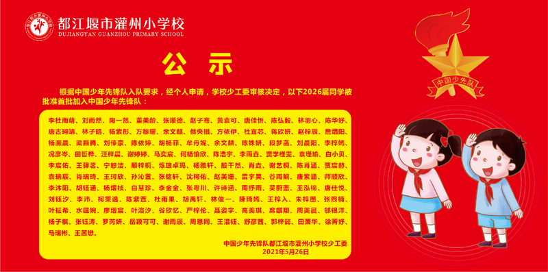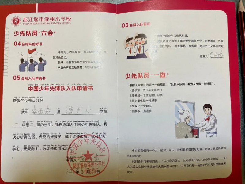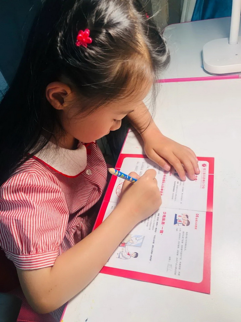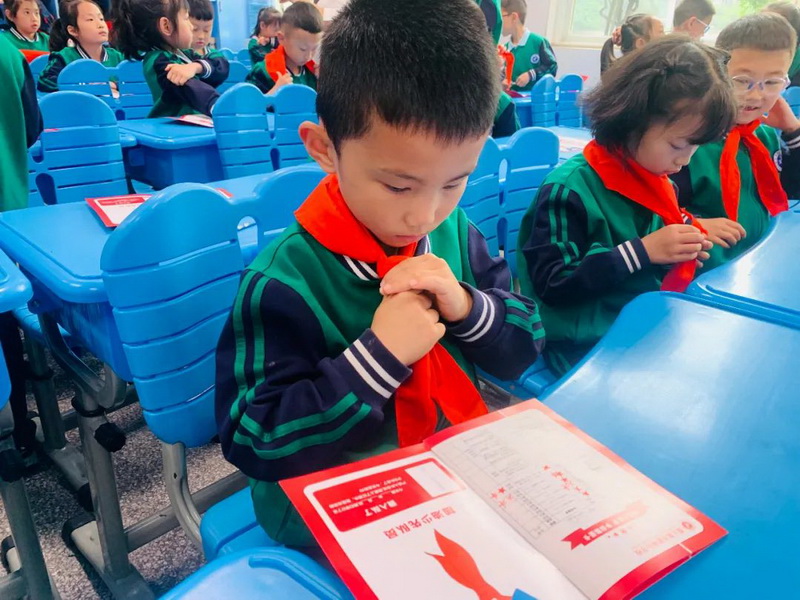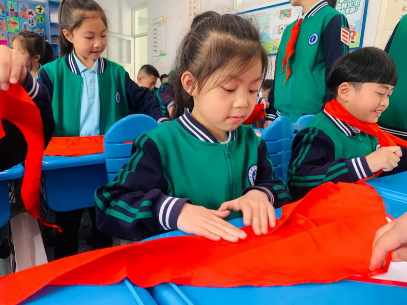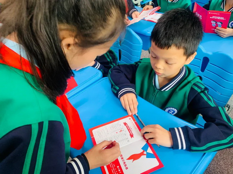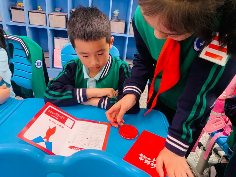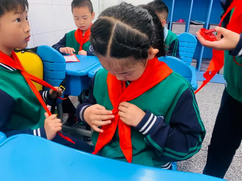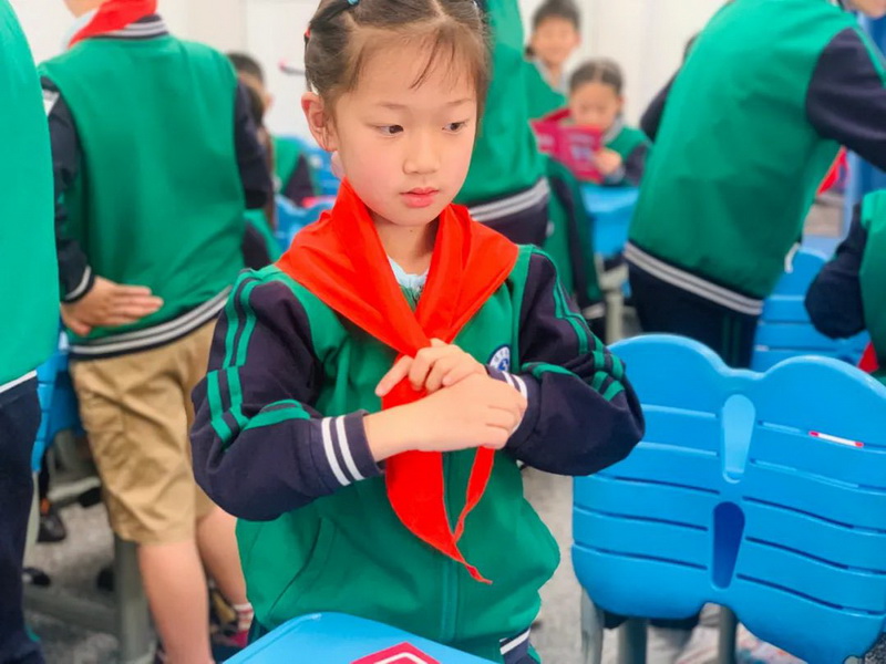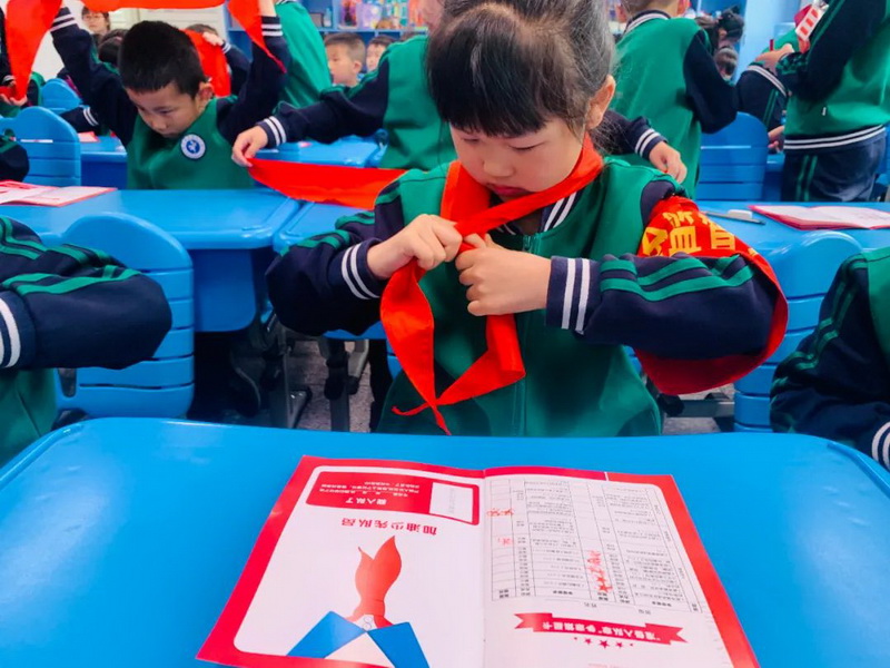 In order to celebrate the 100th anniversary of the founding of the Communist Party of China,implement the rules of joining the Young Pioneers. On Friday, May 28, 2021, our school held a ceremony for the first batch of young pioneers of 2026 to join the team. The whole activity ensured that the children received the education, and enhanced the sense of honor and organizational belonging of the new members.首批入队的一年级小朋友写下入队誓词,立志为党和国家的未来好好学习,天天向上。The first group of students wrote down their vows, determined to study hard and make progress every day for the future of the party and the country.