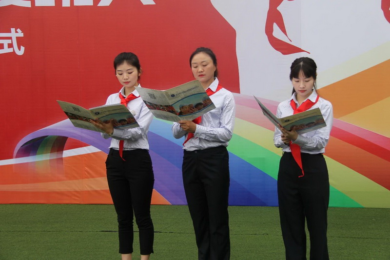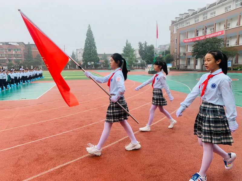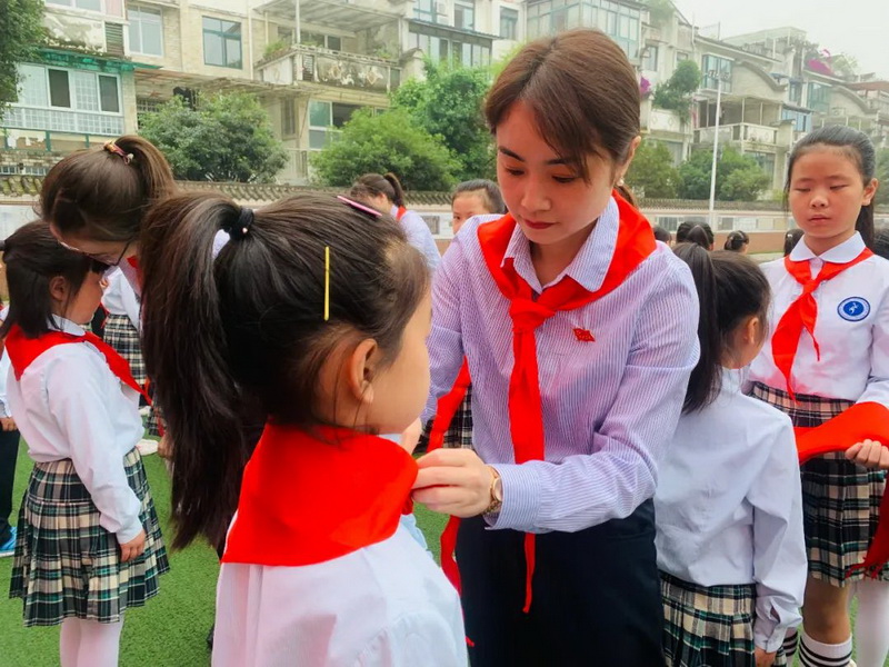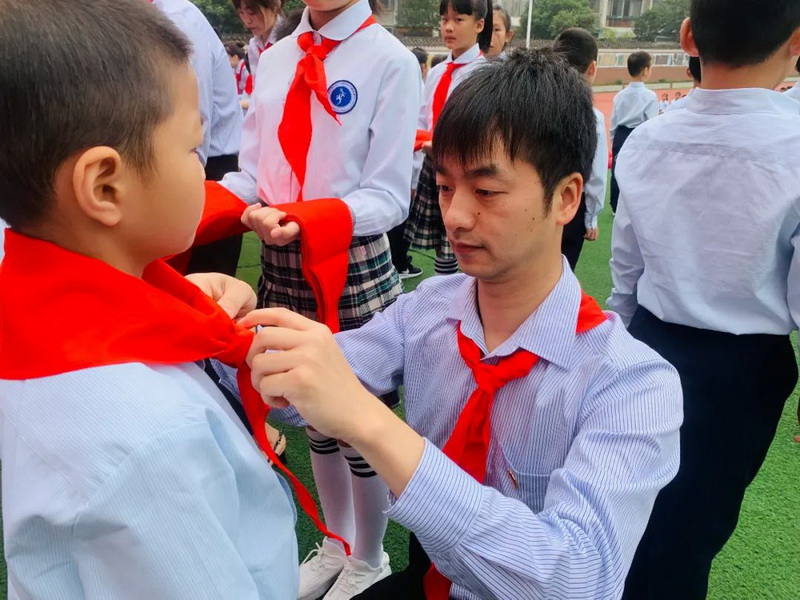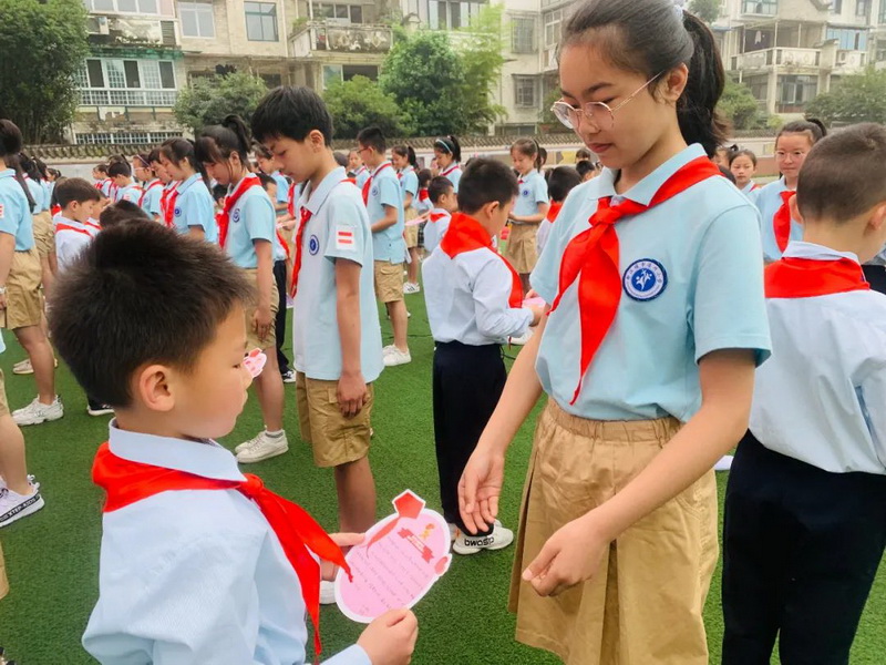 The first batch of young pioneers joined the team with honor, and representatives of Party members tied red scarves on the children who inherited the red mission. Senior brothers and sisters present blessing cards to their younger brothers and sisters. Lan Zeyu, the leader of our major pioneer team, took the oath.