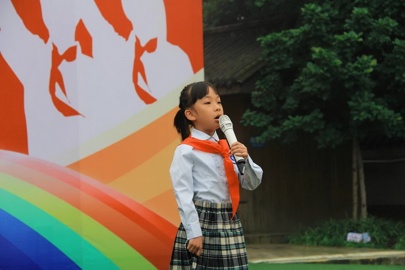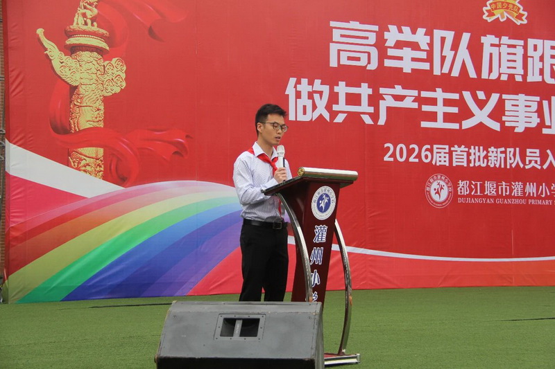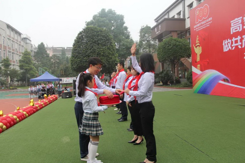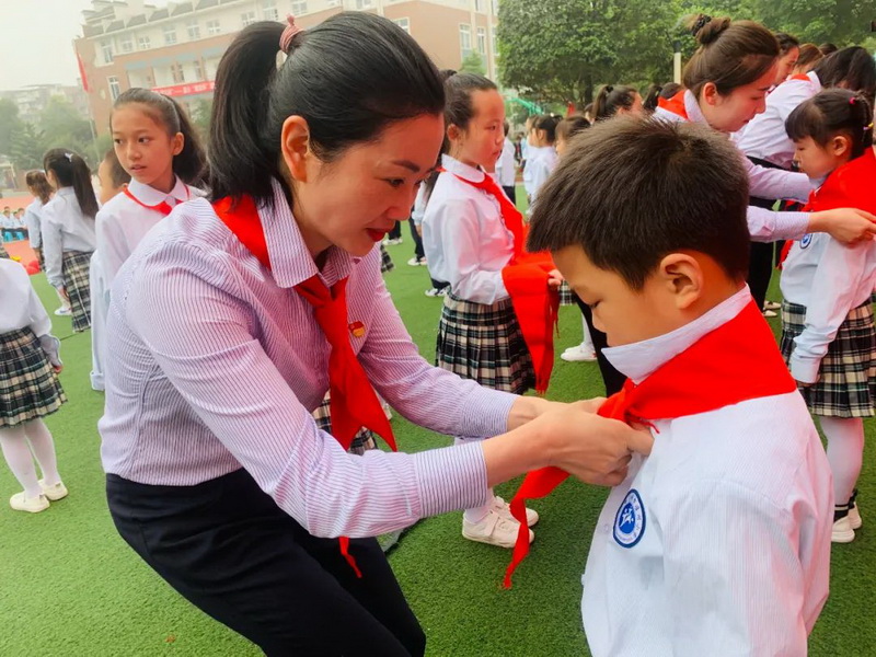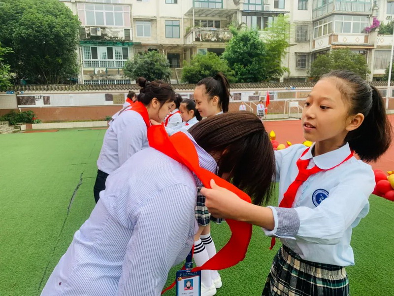 首批少先队员光荣入队,学校党员教师代表为继承红色使命的孩子们系上红领巾,殷殷目光,满盛期望与赞许。高年级的哥哥姐姐们为小弟弟、小妹妹献上祝福卡片。我校少先队大队长兰泽宇带领宣誓。