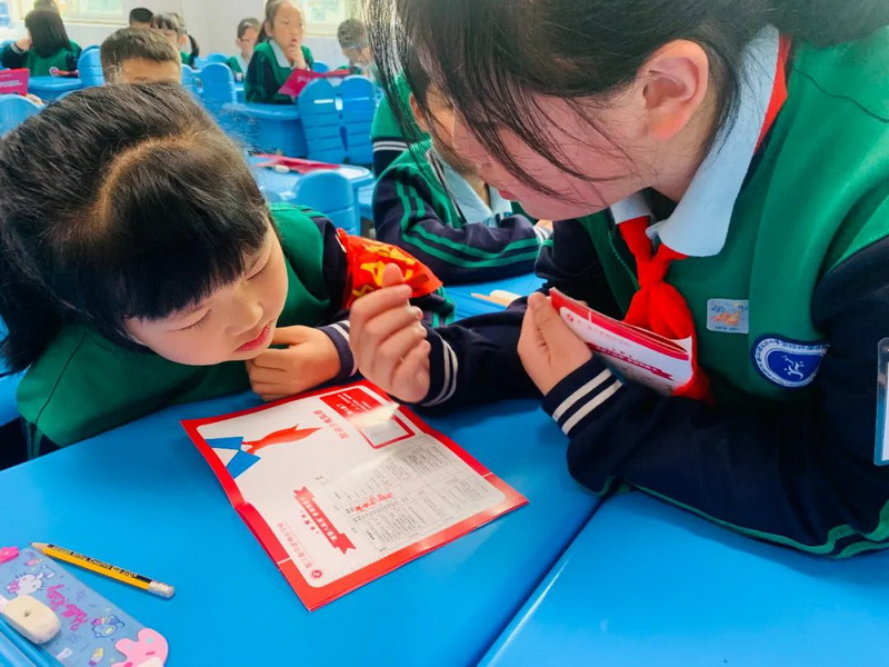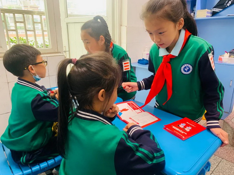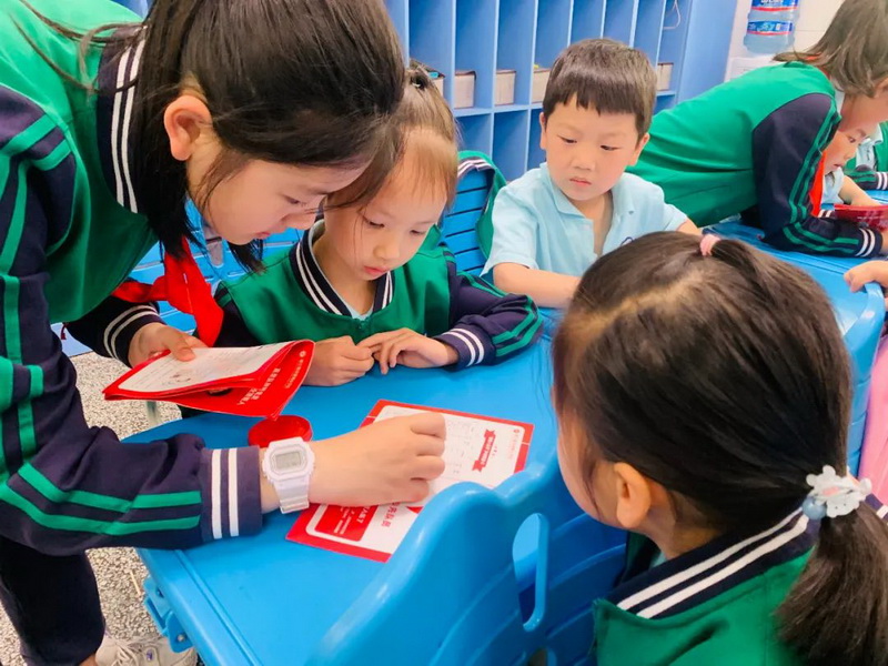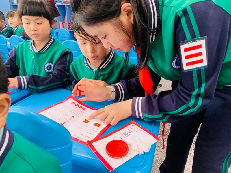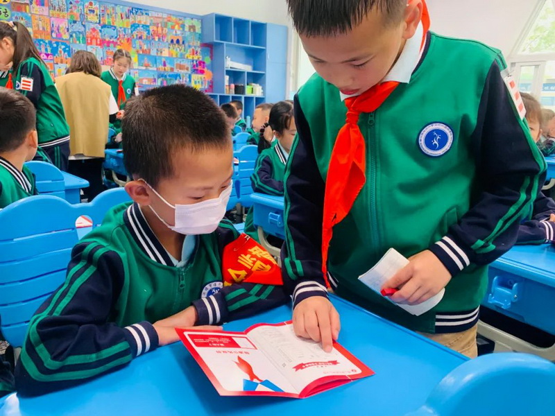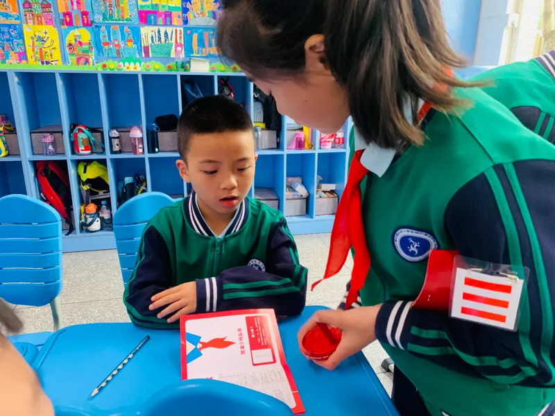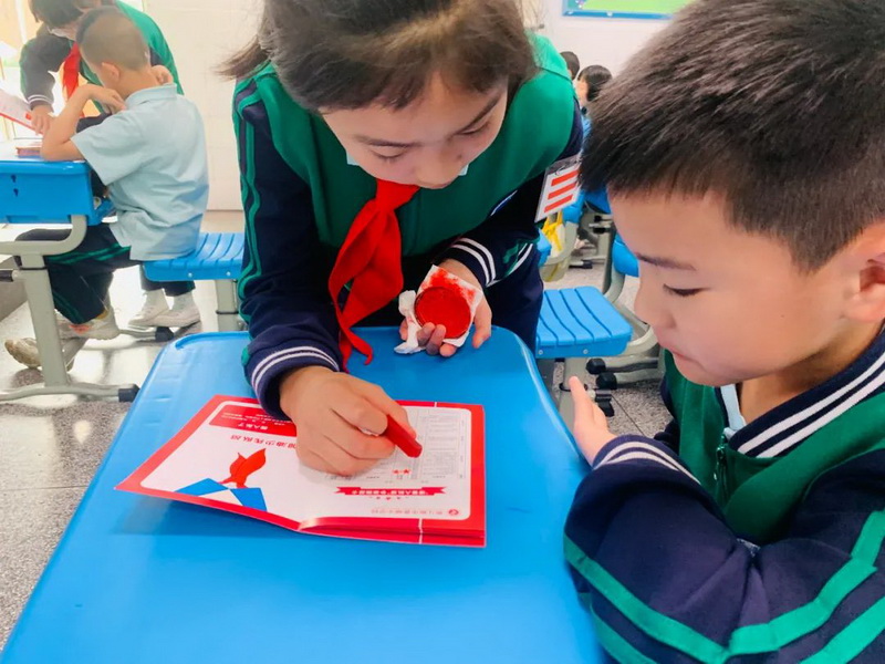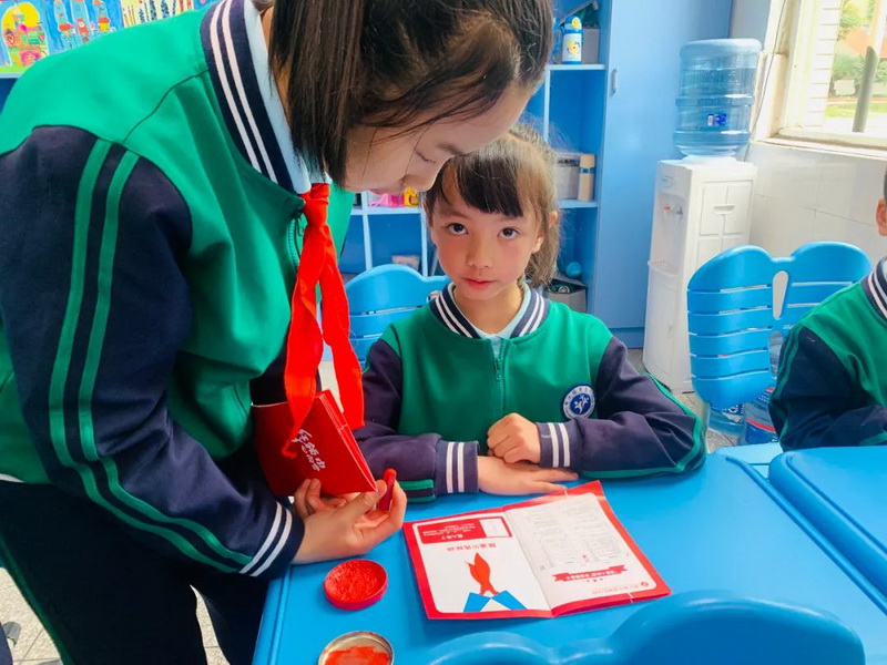 学校少先队大队部在入队前准备了一系列丰富多彩的队前教育课程,浸润着每一个准队员们的心田。预备队员在老师们带领下认真学习少先队“六知六会”等少先队知识。大队委哥哥姐姐对每一位准队员的队前学习情况进行了检查,根据预备队员的表现慎重地在“集星争章卡”上盖章,意味着队员们熟知“六知六会”内容,通过重重考核。A series of education courses have been prepared by the young pioneers brigade of the school before joining the team, which infiltrates the hearts of every prospective member. The reserve team members study hard under the guidance of the teachers.