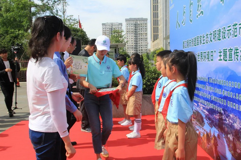 June 5, 2021, is the 50th World Environment Day. The Ecological Environment Bureau of Dujiangyan launched a variety of publicity activities . Representatives from the Municipal People's Court, the Municipal People's Procuratorate, the Dujiangyan Managementand Protection Station of the Giant Panda National Park, and the Municipal Education Bureau participated in the event. 30 student representatives from ourschool also participated.