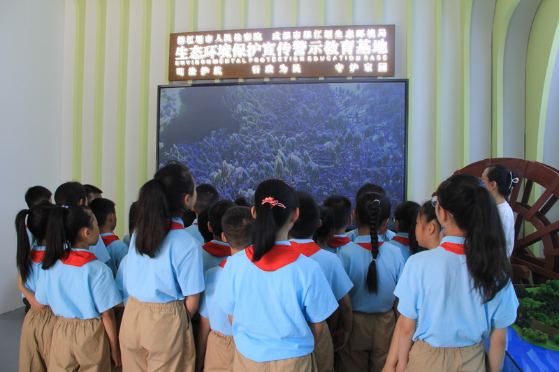 灌州小学校的孩子们在成都市都江堰生态环境局污染防治综合科科长尹丽的带领下,集体参观了都江堰市“堰水清清”生态环境保护宣传警示基地,开展了熊猫课堂、环境资源类违法案例等宣讲。