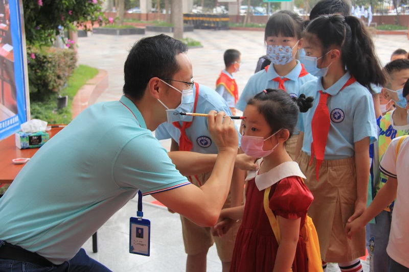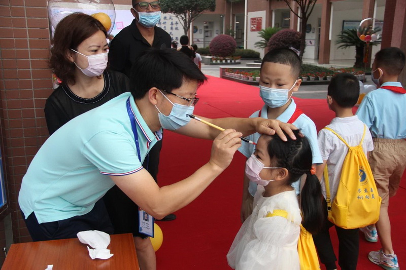 这是什么?你有一点疑惑:老师俯身在你额头上轻轻挥下毛笔。你听见“朱砂启智”的声音,老师们祝福你越来越聪明。