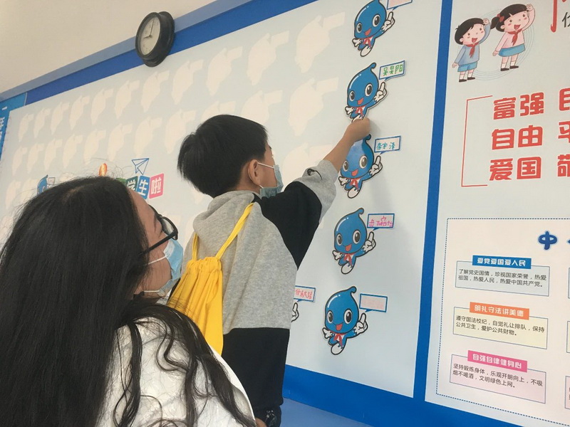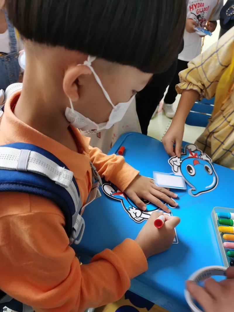 在哥哥姐姐们赠送的名牌上写下自己的名字,再把它郑重地贴在墙上,宣告从此成为班级的一员。Write down yourname on the given brand, and then solemnly stick it on the wall to announcethat you will become a member of the class from now on.