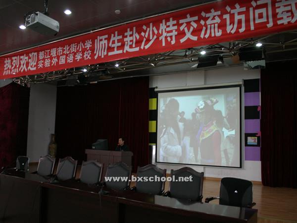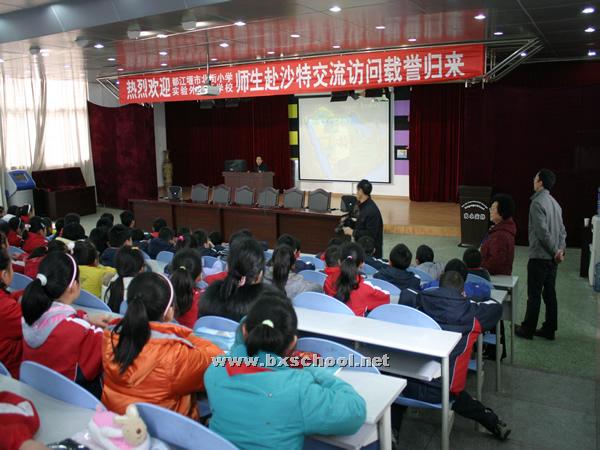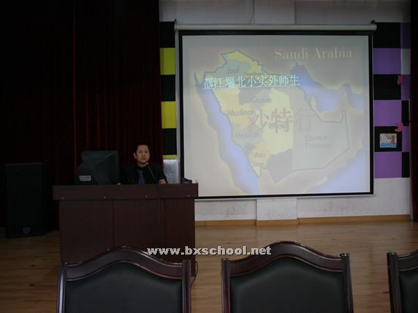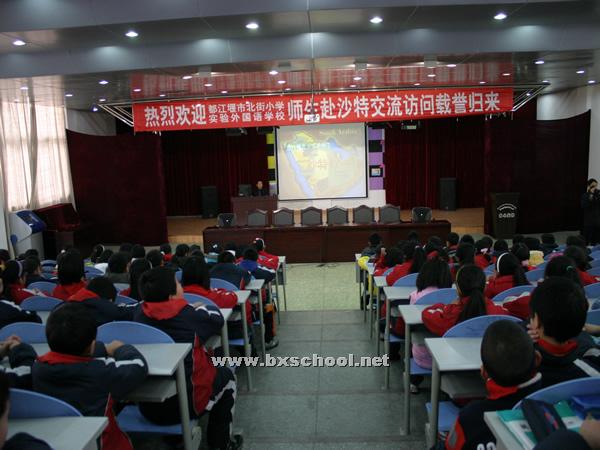 今日下午,在我校学术厅,刚刚赴沙特交流访问载誉归来的师生与五年级的同学共享了他们此行的收获和荣誉,孩子们不仅了解了沙特这个以石油闻名的国家的风土人情,也一起见证了中沙两国人民的深厚友谊,更是收到了北京和沙特人民对地震灾区的热切关怀和问候。