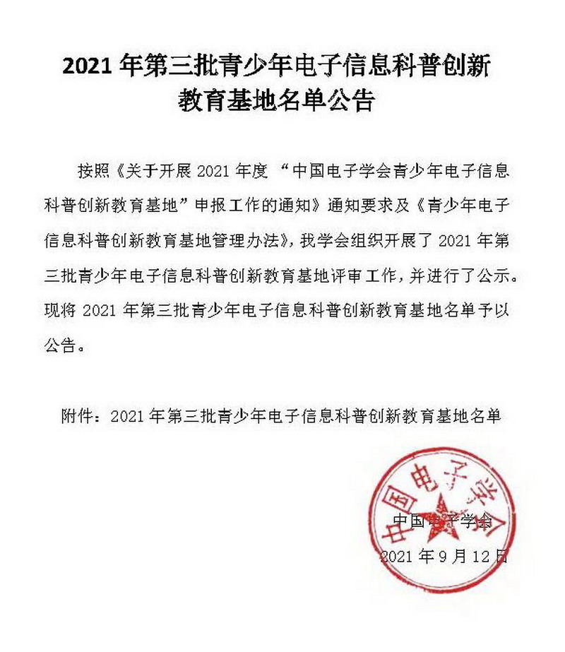 The National Innovation Education Base of electronic information science popularization ,which is carried out by China Electronics Society ,is the carrier of electronic information technology personnel training and competition organization.