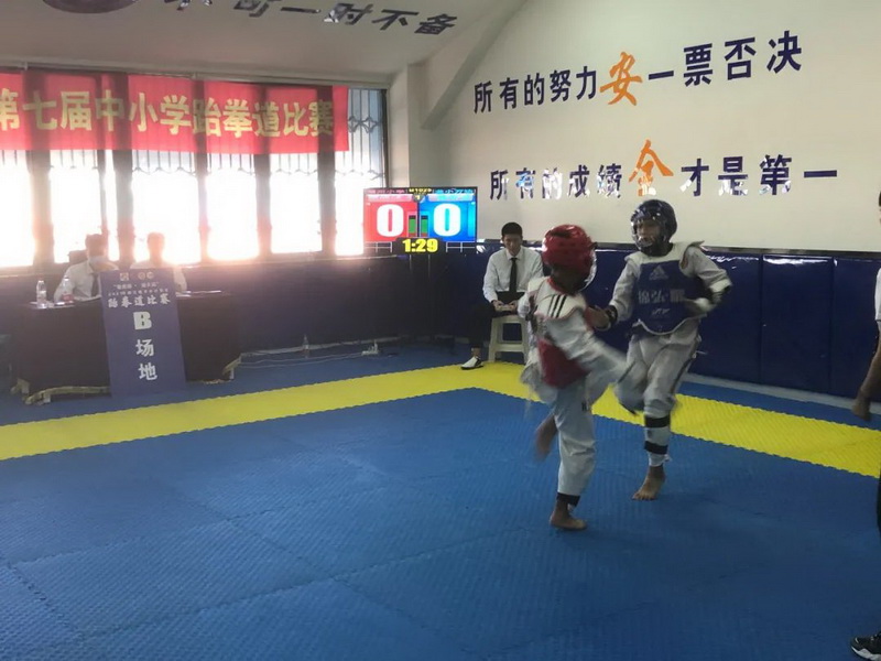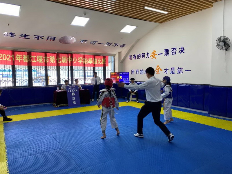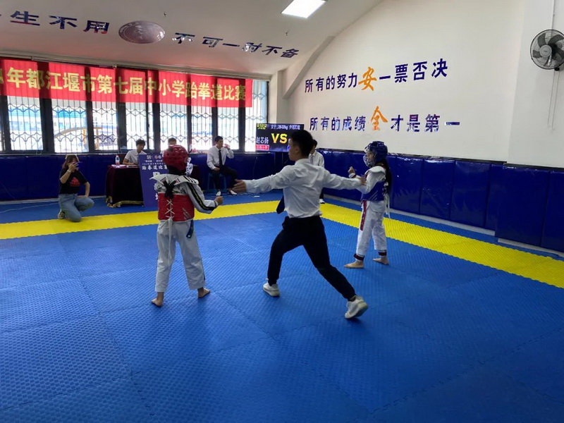 The taekwondo championship of Dujiangyan primary and secondary schools in 2021 was held at the sports center on September 19th. More than 20 students from our school took part in the competition.
