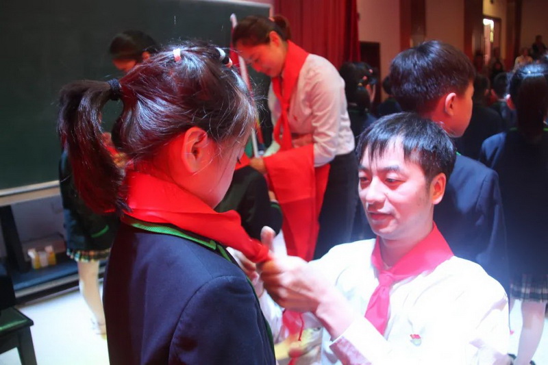 在庄严的国歌声中,五星红旗冉冉升起;在肃穆的注视之下,少先队旗缓缓飘过。庄严的队歌之后,新的少先队员名单公布,我校优秀党员为红色事业的新生力量,系上象征着革命先烈铁血记忆的红领巾。