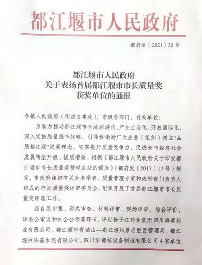 都江堰市市长质量奖是都江堰市人民政府对都江堰市标杆示范性、管理质量优秀、高品质的企业、单位等颁发的奖项,我校荣获“首届都江堰市市长质量”提名奖。