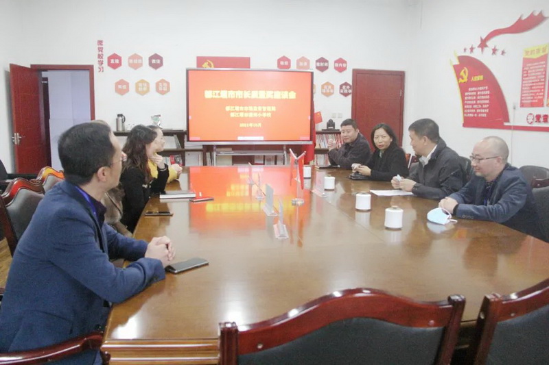 2021年10月21日,都江堰市市场监督局局长罗斌,都江堰市知识产权局主任李智,都江堰市市场监管局质量科科长张云鹏,都江堰市市场监管局幸福分局局长方启一行,到我校进行“市长质量奖”复查,对我校办学情况进行实地考察,并进行了座谈会议。