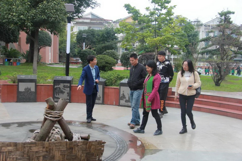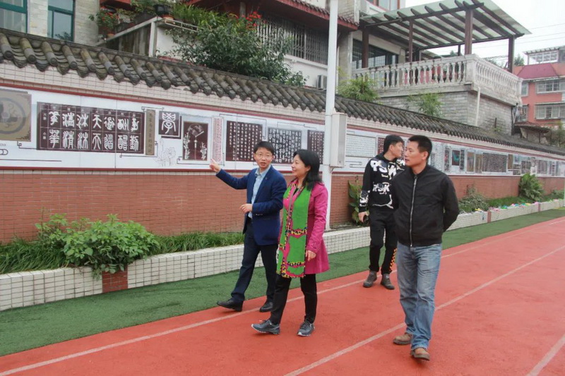 Leaders of the Affiliated Elementary School of SFAES visited the main gate,playground, calligraphy wall, back garden and other places of our school.Director YeTiping introduced in detail various characteristic projects of ourschool: National Basketball Characteristic School, National CalligraphyCharacteristic School, Calligraphy Wall, Steam Course, Water Writing Platform,etc. Leaders of the Affiliated Elementary School ofSFAES listened carefully to the introduction ofdirector ye, praised the construction of various characteristic projects of ouruniversity, and spoke highly of the work of our university since itsestablishment.