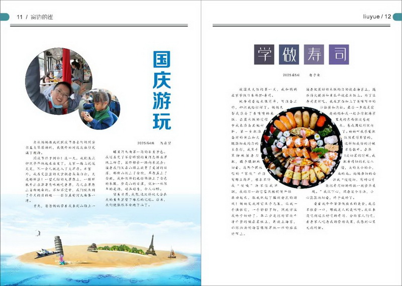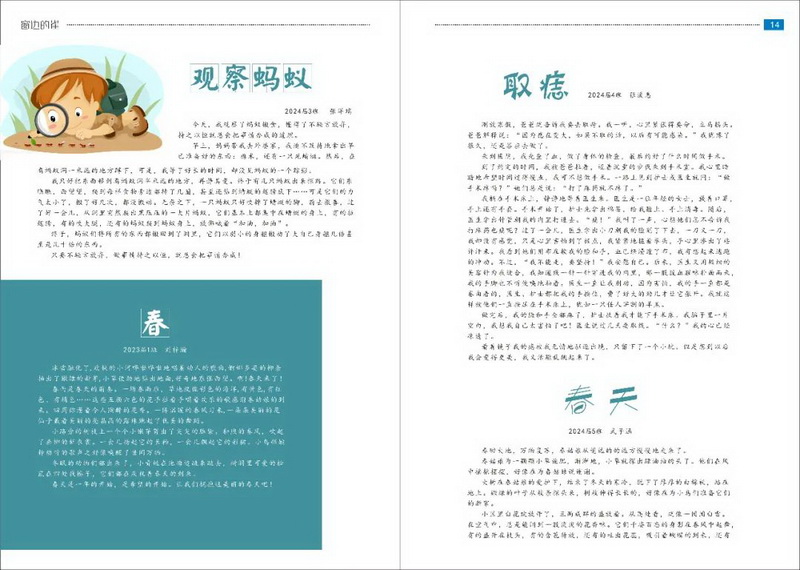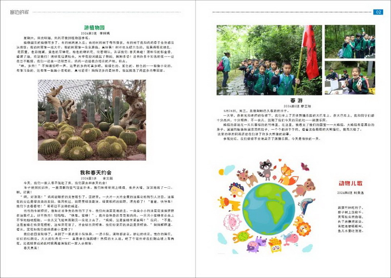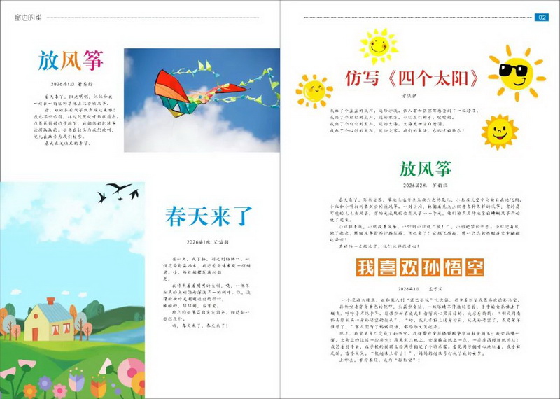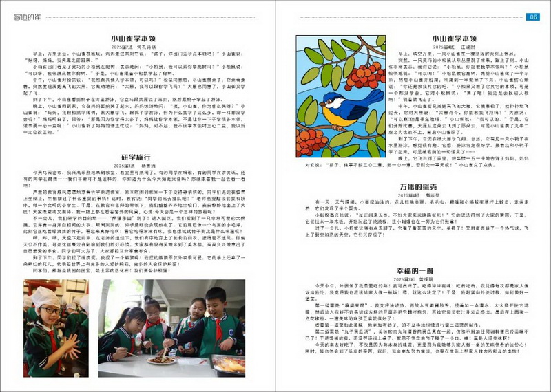 “窗边的雀”这一栏目在《六月》校刊多次改版中一直保留下来,代表着灵性创作的自由,不拘一格的文字呈现。而现在我们语文学科作业基于教材经典语例的“随课小练笔”——仿写、扩写、缩写、改写等,跨学科综合实践作业“科学探索”“欣赏表演”“社会实践”中留下的观察日记、小橘子导游日记,研究报告、科创作品、个人作品集等,让“窗边的雀”这15年来的经典栏目焕发了双减下的时代特征。