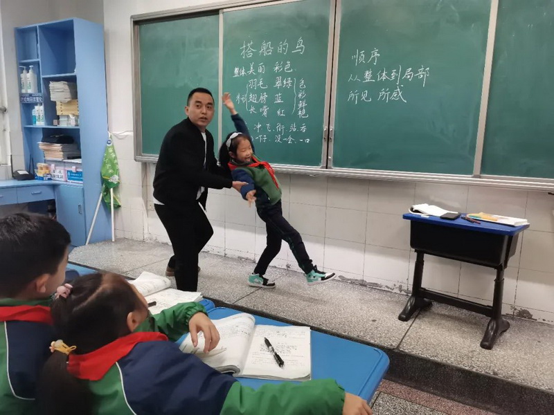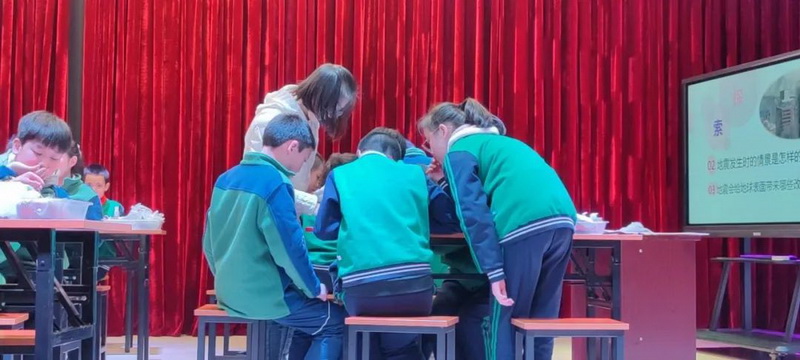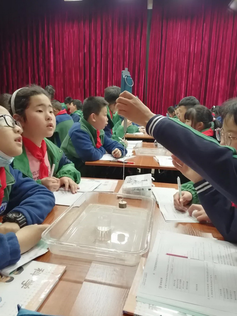 科学课胡恒硕老师和学生坐在一条凳子上看食盐溶解,