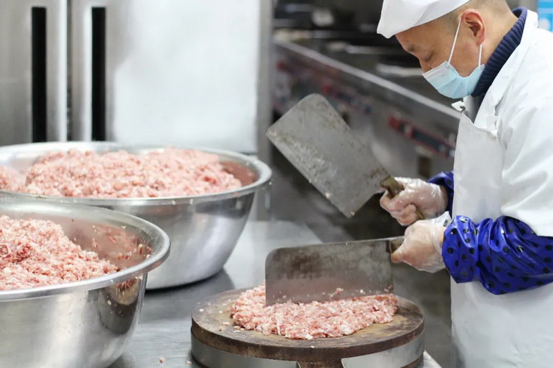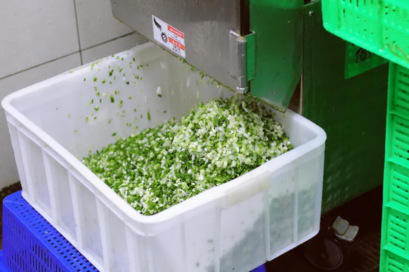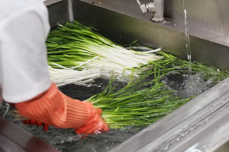 新鲜的猪肉和韭菜是美味水饺的前提,清洗、加工后的原材料经过厨师的调配变成了诱人的饺子馅儿,适当的荤素搭配比例在为孩子们提供美味的同时也带来健康。