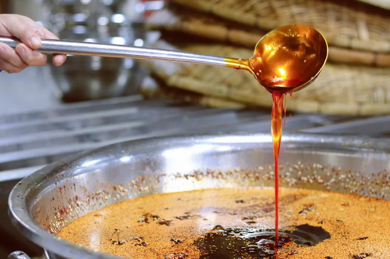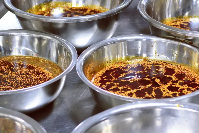 The soul chilli oilin the sauce is made three days in advance by chefs, who say that the chillioil made three days in advance will taste better after it is placed.In theafternoon, cooks cooked the sauce with sugar, vinegar, prickly ash oil and garlic, then added the secret chili oil. And there you have it!