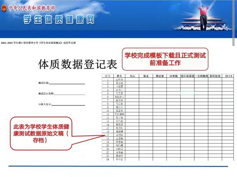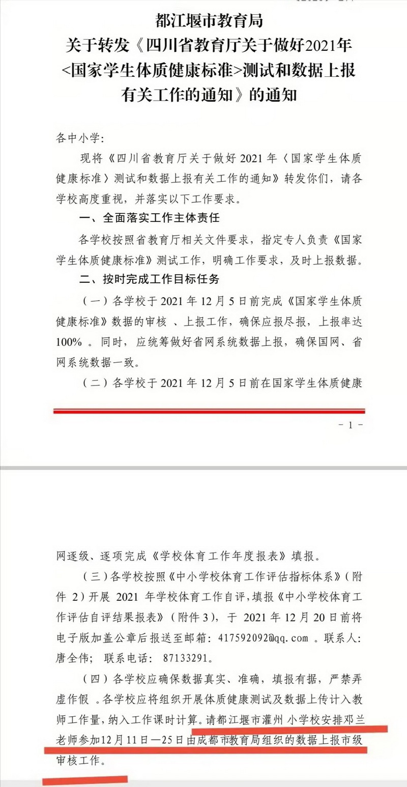 为全面落实《四川省教育厅关于做好 2021 年〈国家学生体质健康标准〉测试和数据上报有关工作的通知》,11月25日都江堰市教育局召开了《学生体质健康测试数据填报系统》操作专题培训,我校教育教学质量监控中心干事邓兰老师受邀参加会议并主持培训,培训中针对全市60余所中小学整理和上报体测数据提出了:规范、严谨、真实、有效、公开的总体工作要求。
