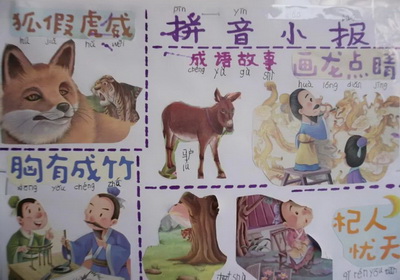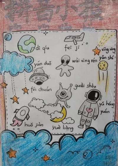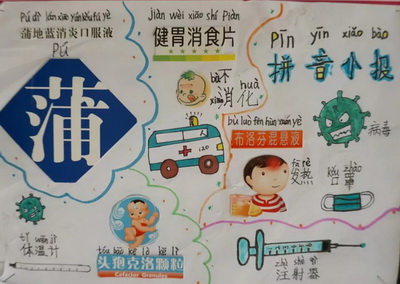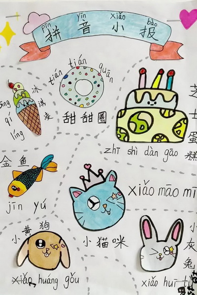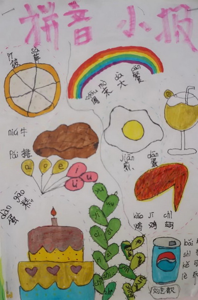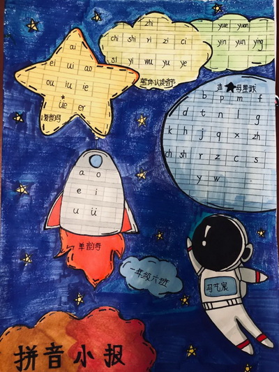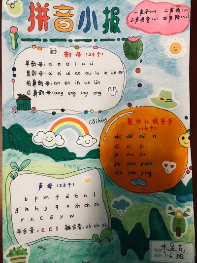 一幅幅拼音小报,将教室外的文化墙装扮成了一道美丽的风景线,听,下课铃响,孩子们纷纷走到文化墙边,不由自主地拼读起来。