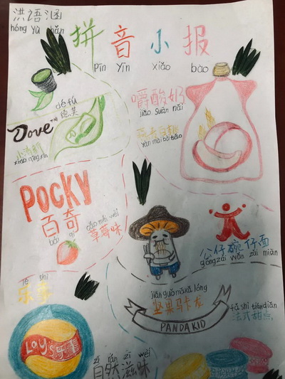 Look! The children drew Pinyin colors with their own hands on a piece of white paper.