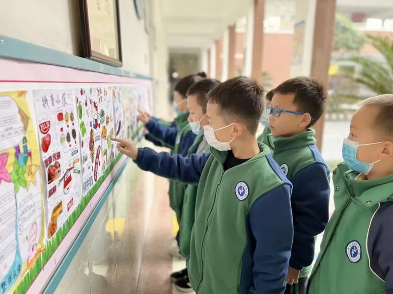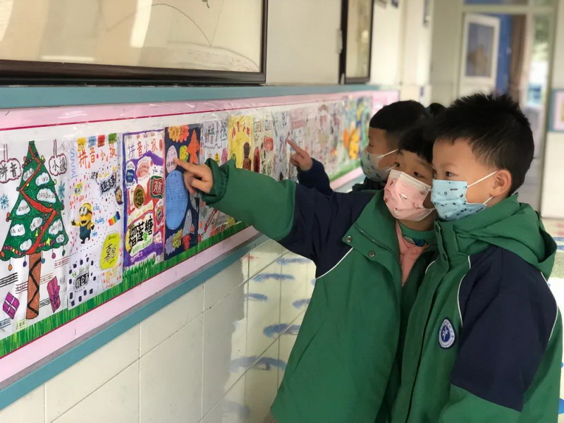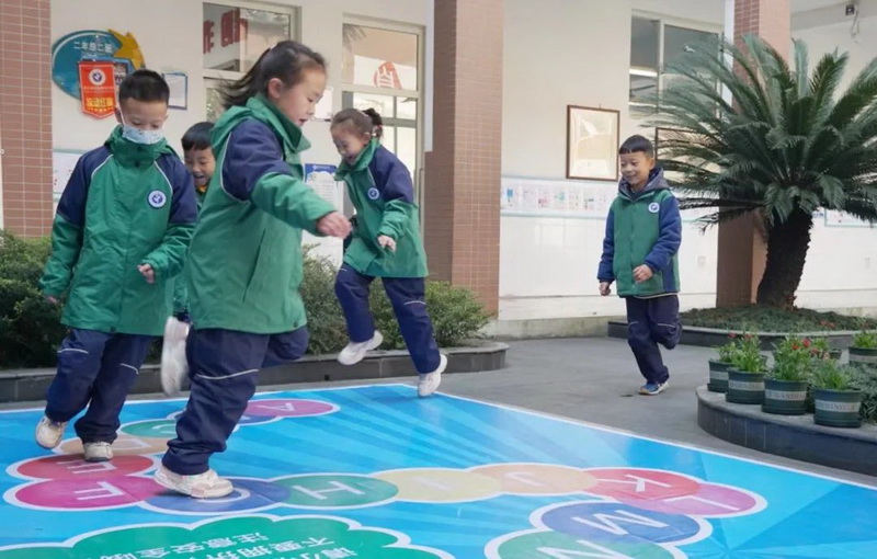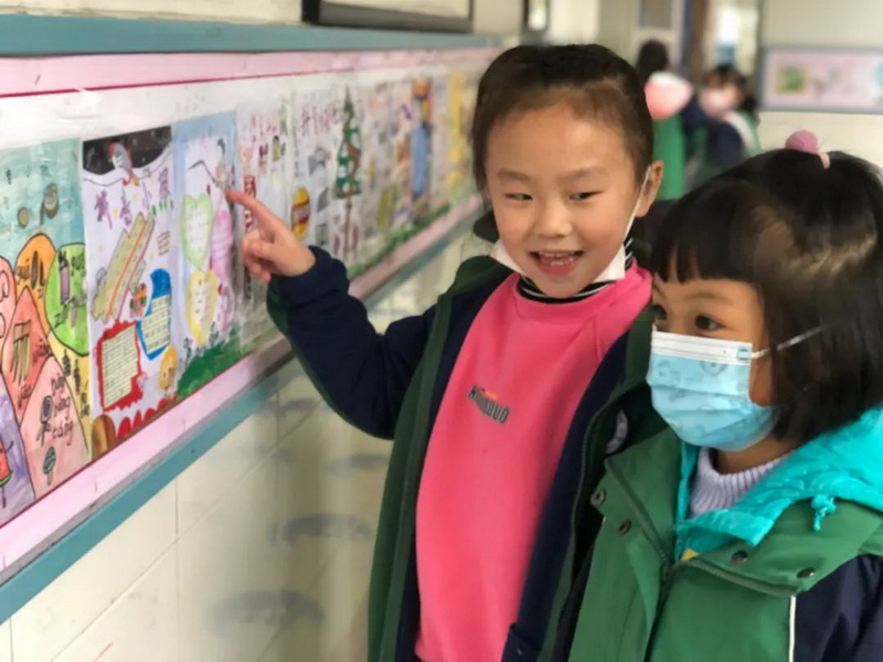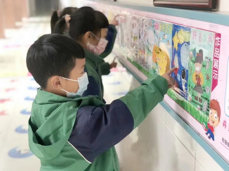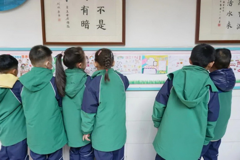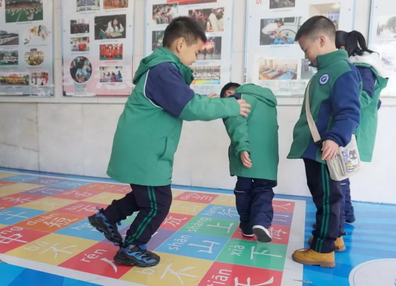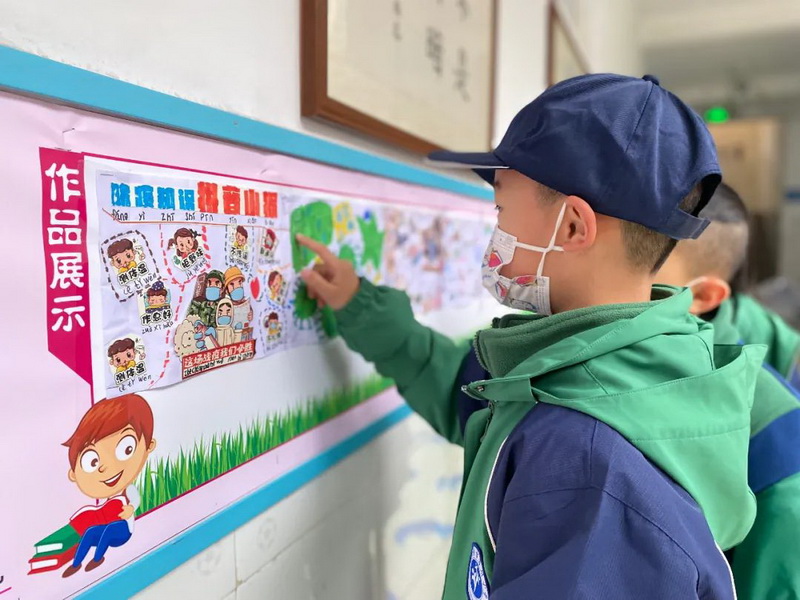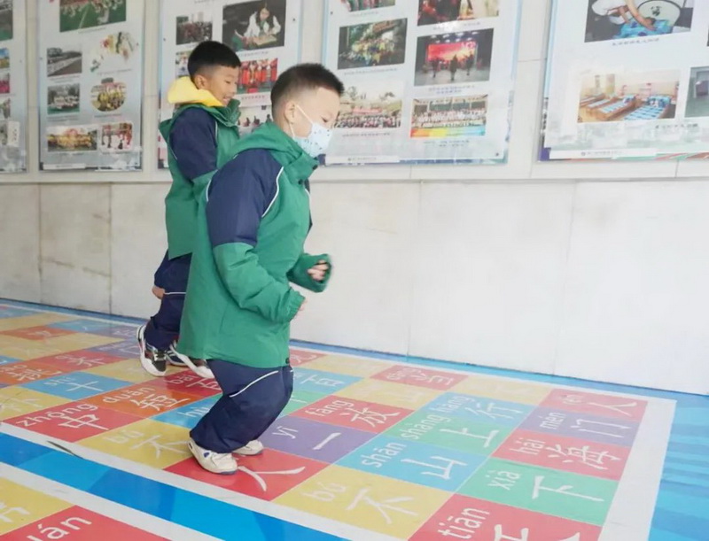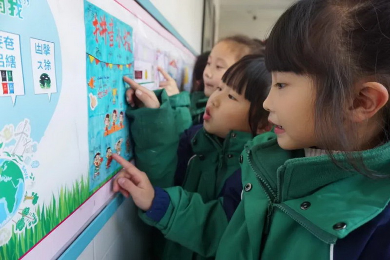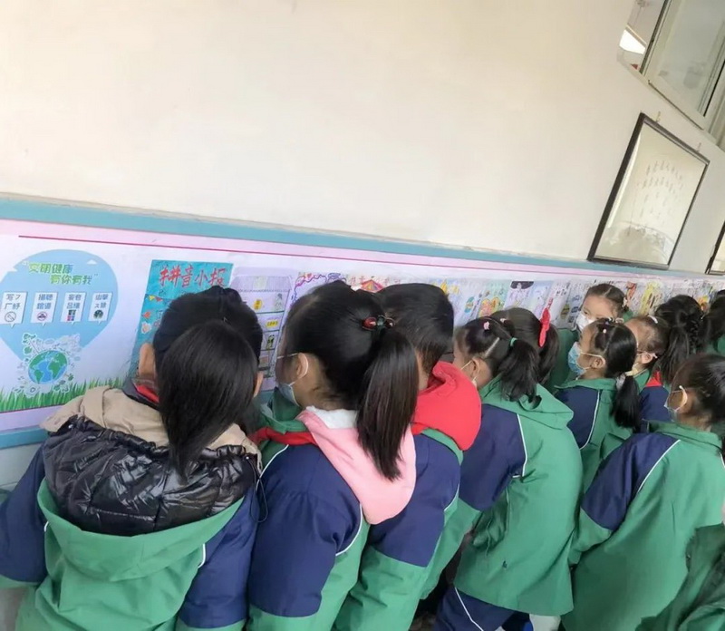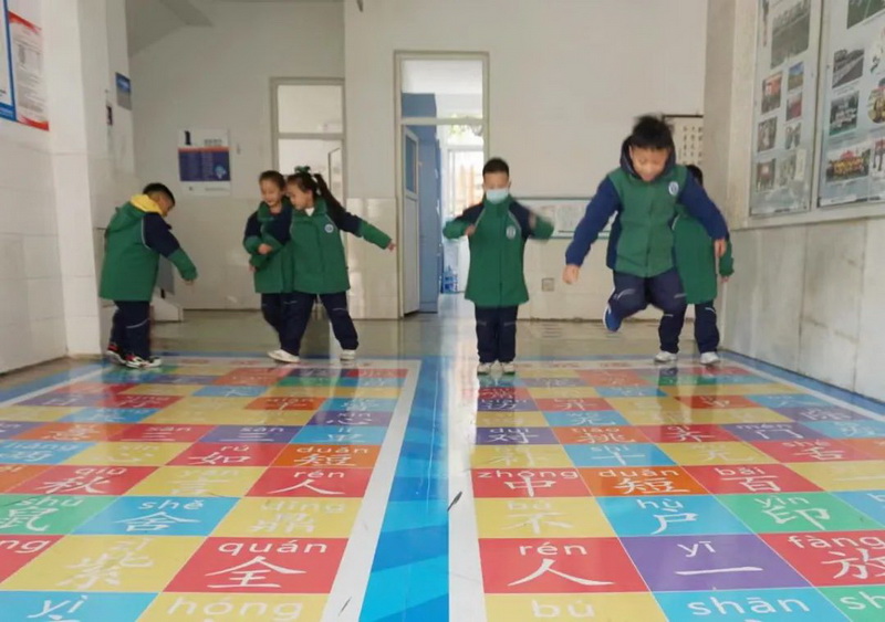 Pinyin tabloids dress up the cultural wall outside the classroom as a beautiful scenery. After class, the bell rings, and the children go to the cultural wall and spell it involuntarily.