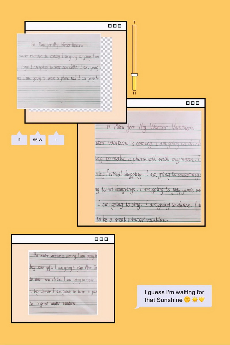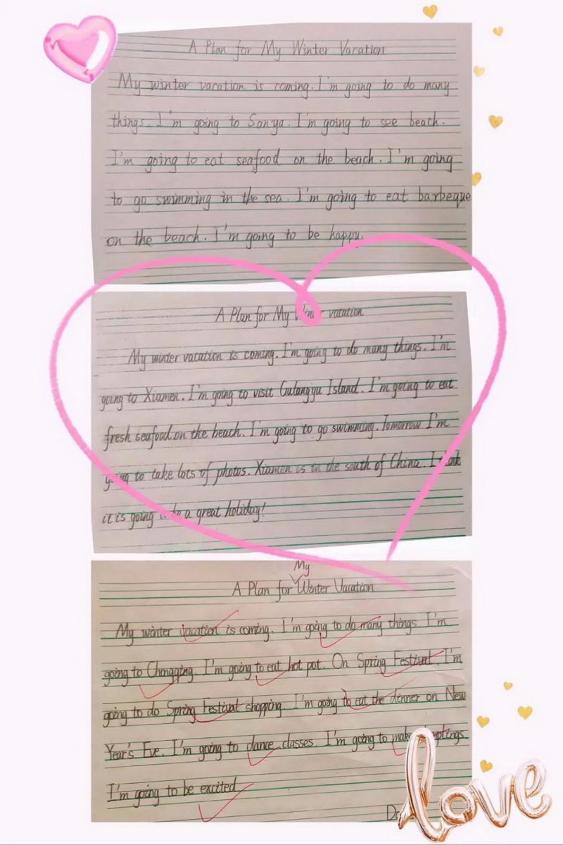 The children made winter vacation plans. Through writing, students carried out diversified and true self-expression, got used to English language thinking, and promoted their understanding of language.