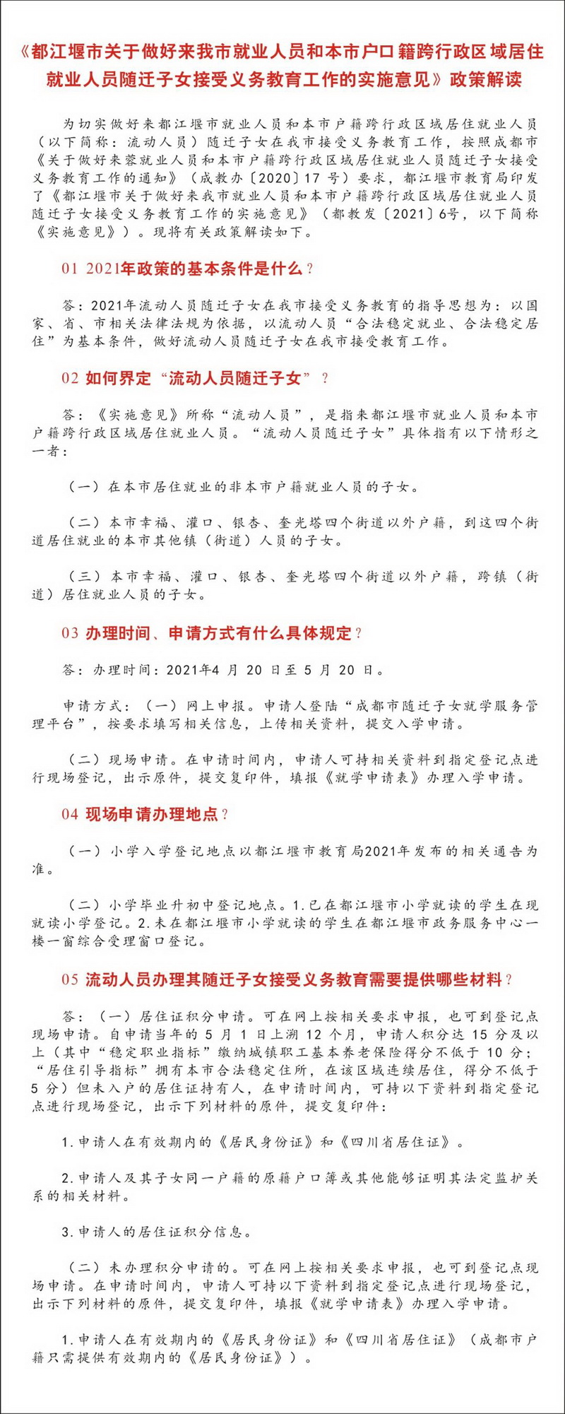 我校从市教育局获悉《都江堰市2021年进城务工人员随迁子女接受义务教育政策解读》。请相关家长认真阅读并着手准备相应材料。