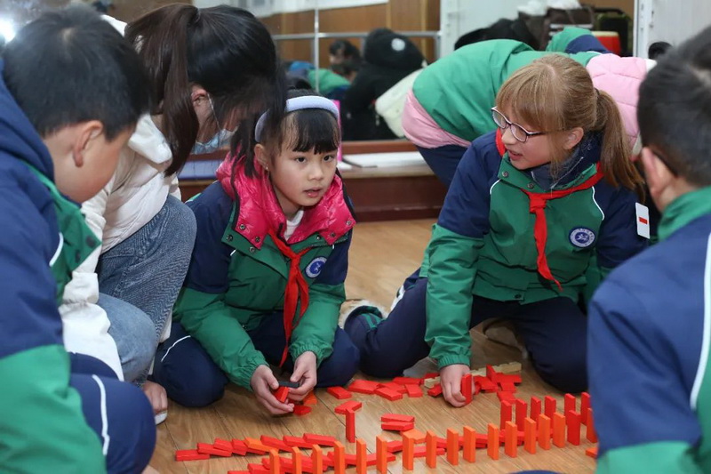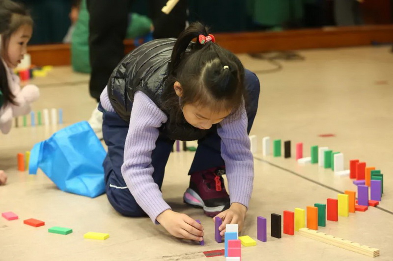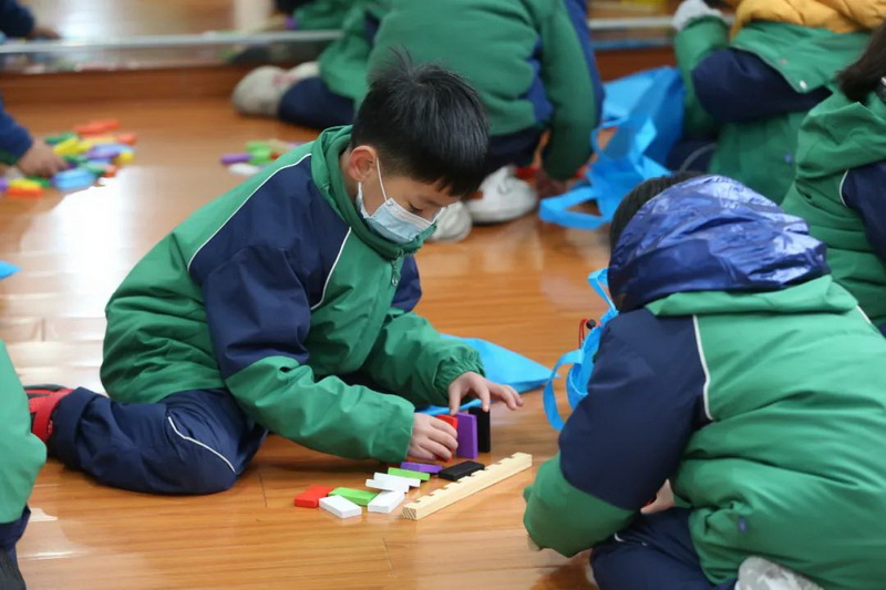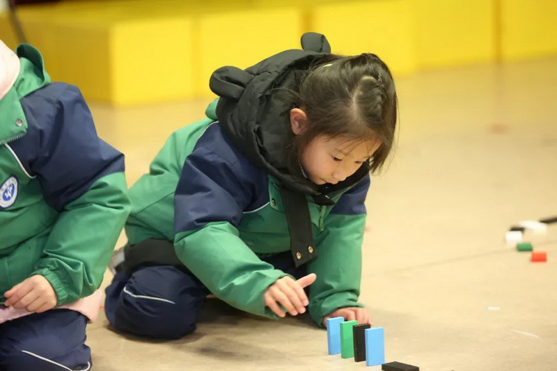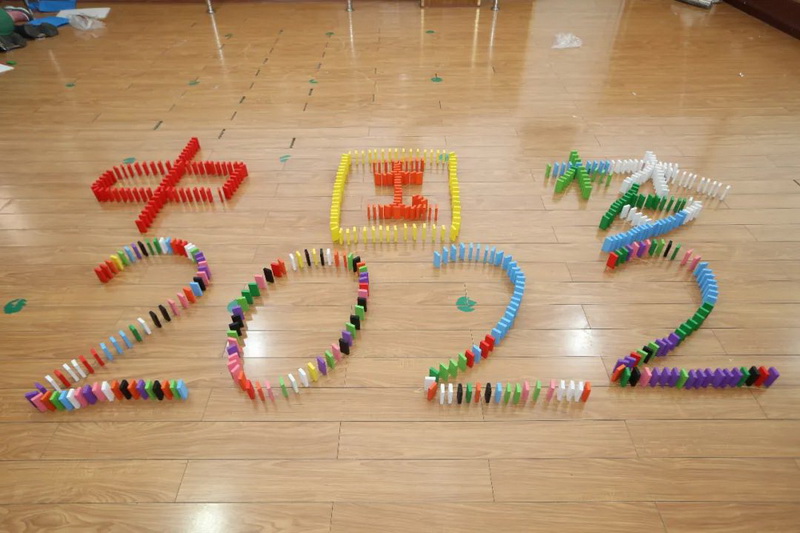 On December 25, 2021, all teachers and students learned about dominoes together. Children looked for the origin of dominoes, understood the world record of dominoes, and explored the "domino effect". Children systematically learned how to build dominoes by watching open the secret domino of Beijing Winter Olympics.