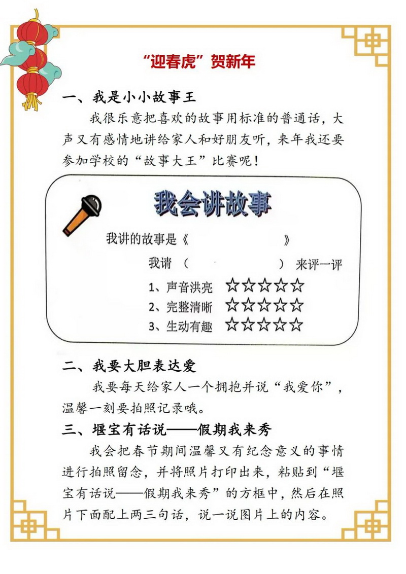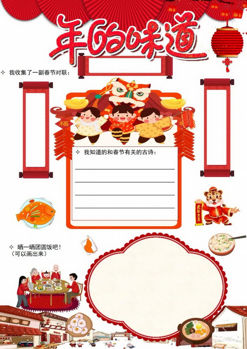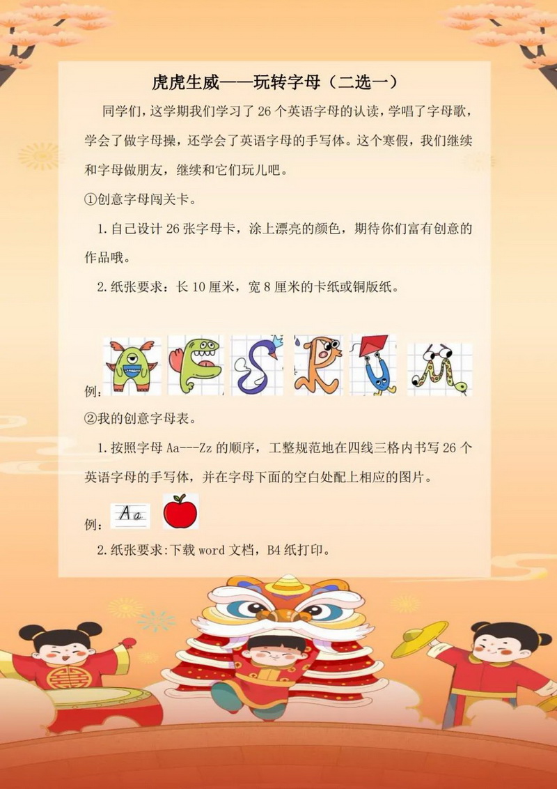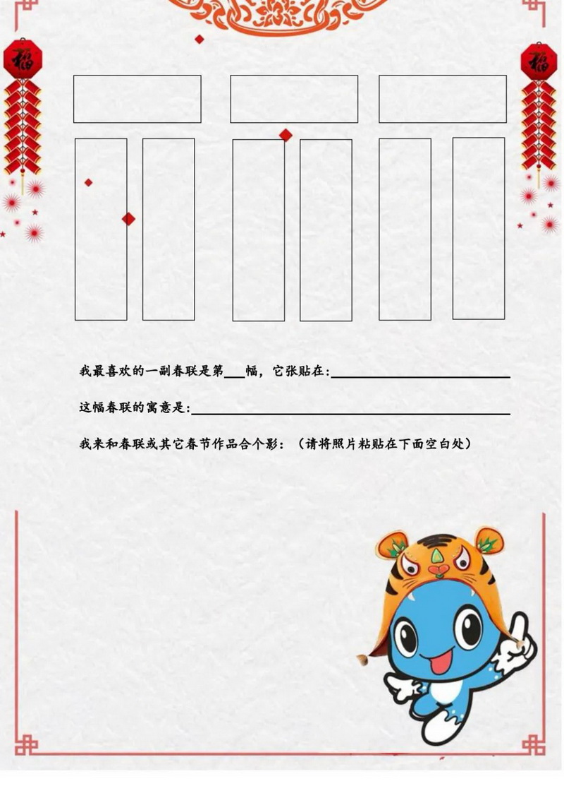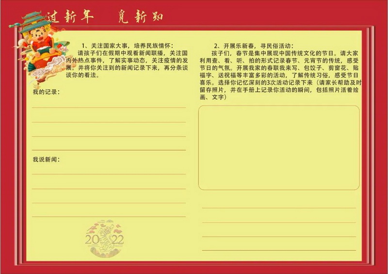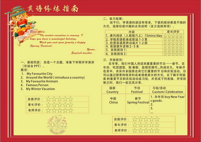 传统节日与中华民俗承载着民族文化的精髓与气质,随着冬奥的步伐越来越近,我们各学段的寒假自主实践中均涉及与之有关的课程。有“爱国虎,看冬奥”,有“中国娃讲中国故事”,也有请你设计以英语“Chinese New Year”为中心的知识点思维导图。