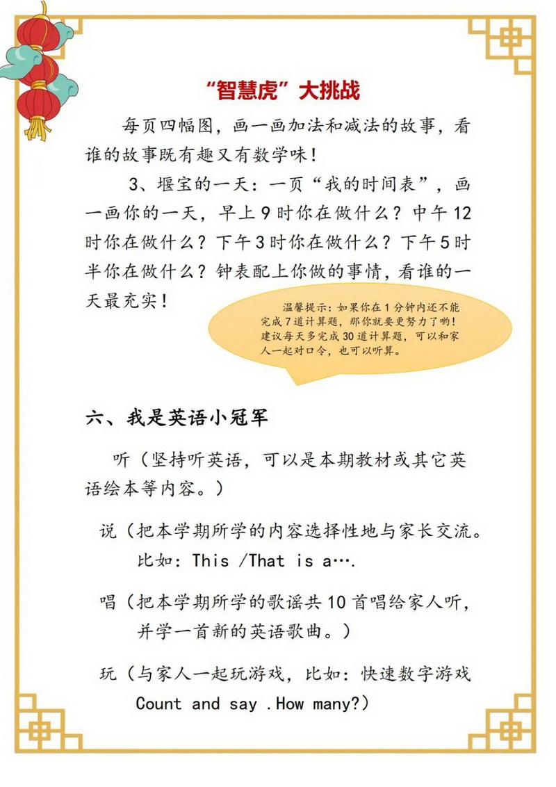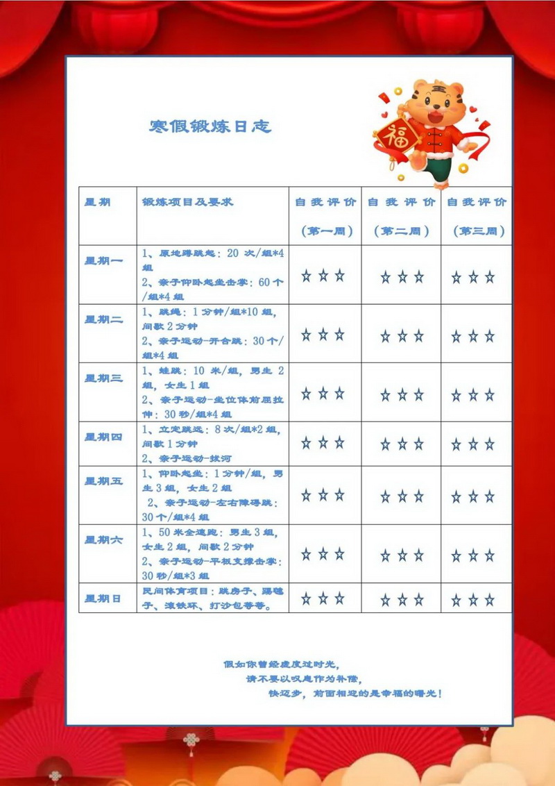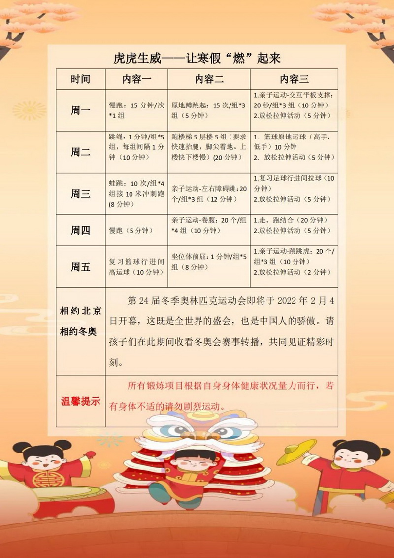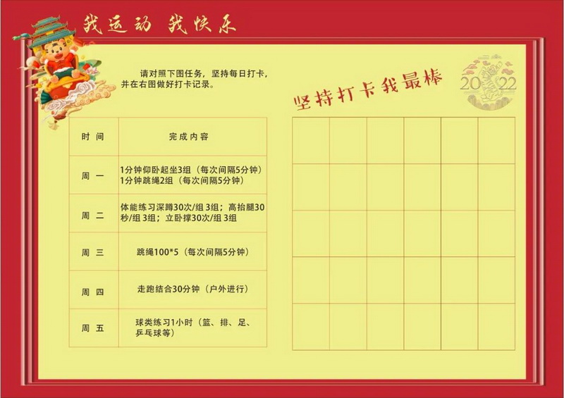 健康虎——让假期“燃”起来(Healthy tiger)跳短绳,球类运动,还有有趣的亲子运动:脸盆接乒乓球、搭桥过河、交互平板支撑等等。我们的每项运动老师们都安排了时间、次数和强度,希望和家人互相监督运动时也要注意安全哟!期待春暖花开时,学校运动场上的你生龙活虎充满力量!