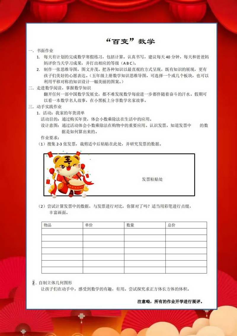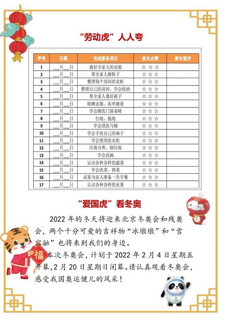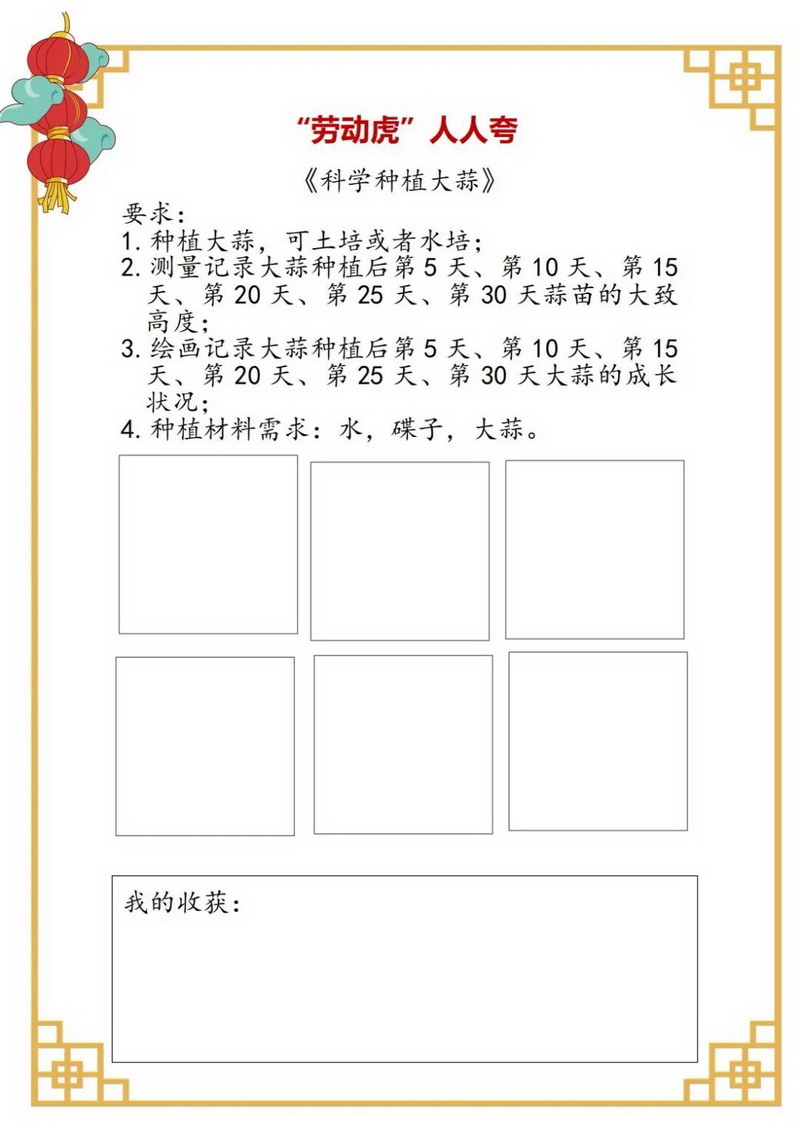 勤劳虎——今天我当家,包花样饺子(Industrious tiger)同学们,利用假期跟家人学做几道菜吧,也可以上网查菜谱自学哟。把自己最拿手的一道菜,放在年夜饭的餐桌上给亲人们品尝,附上你和美食的照片,开学跟同学们好好交流交流。一二年级的同学可以种植大蒜,可土培或者水培,测量记录并绘画大蒜种植后不同天数的大致高度及生长状况。
