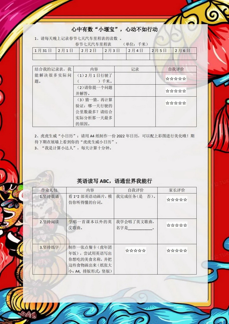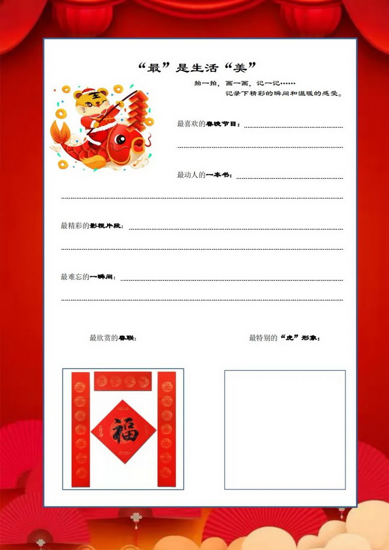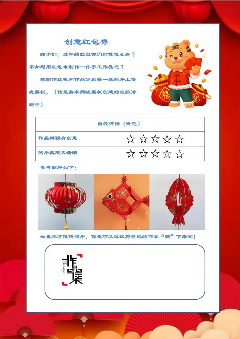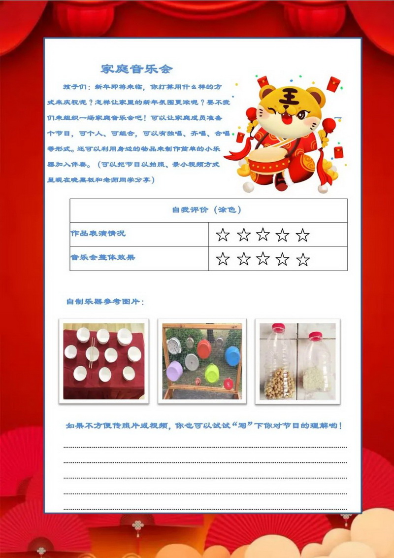 勤劳虎——今天我当家,包花样饺子(Industrious tiger)同学们,利用假期跟家人学做几道菜吧,也可以上网查菜谱自学哟。把自己最拿手的一道菜,放在年夜饭的餐桌上给亲人们品尝,附上你和美食的照片,开学跟同学们好好交流交流。一二年级的同学可以种植大蒜,可土培或者水培,测量记录并绘画大蒜种植后不同天数的大致高度及生长状况。