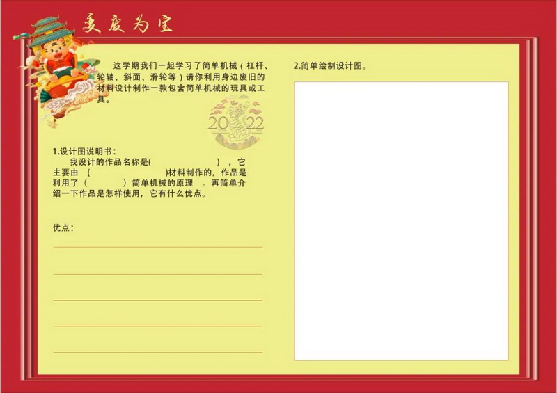 除了可以剪窗花,动漫老虎之外,吃了年夜饭后,家里的厨余垃圾一定有许多用剩的菜根:胡萝卜根、芹菜根、生菜头……这些看似废弃的厨余菜根,其实依然焕发着生命力呢,问问身边的人,与伙伴们做个实验让有的菜根“起死回生”。可以“简单绘制设计图”,将我们这学期学了的简单机械(杠杆、轮轴、斜面和滑轮等),利用身边废旧的材料设计制作一款包含简单机械的玩具或者工具。