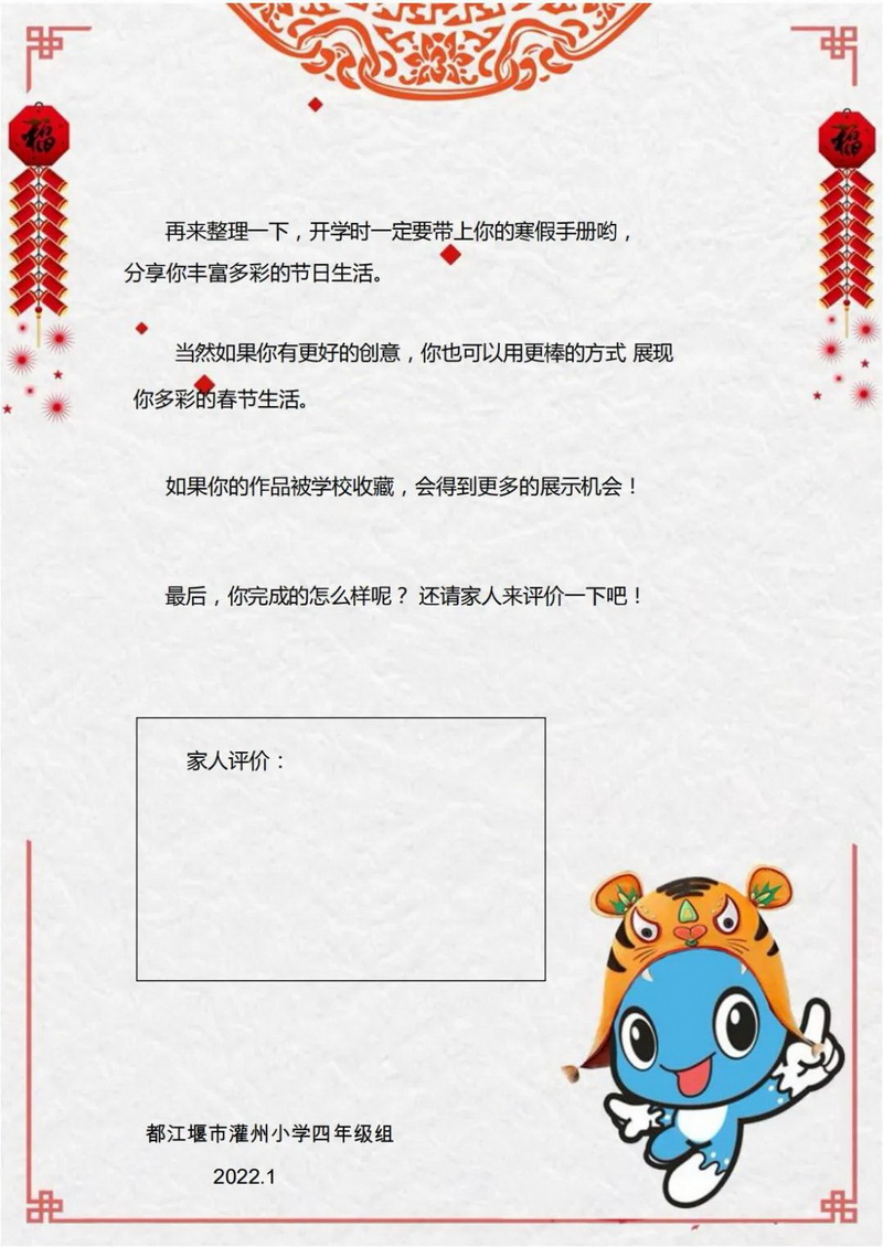 “玉虎迎春,堰宝生威”,亲爱的孩子们,假期来临啦!当“冬奥”与寒假相遇,灌州小学共生课堂也延伸到广阔的天地中,我们为大家设计了“乐集五虎”实践探究活动的融创课程,希望您和家人在这年味十足中品味着五育并举到共生的成长喜悦!