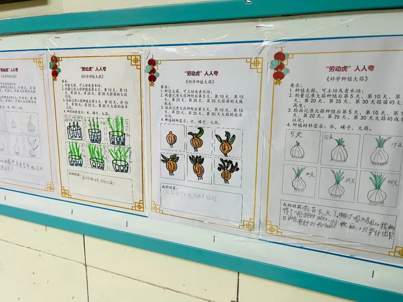 During the fun winter vacation of the first grade, the children gathered five tigers, scientifically practiced garlic planting, and experienced the customs and culture of the New Year to preserve the warm and beautiful moments.