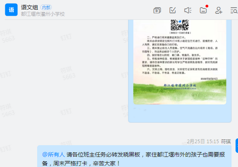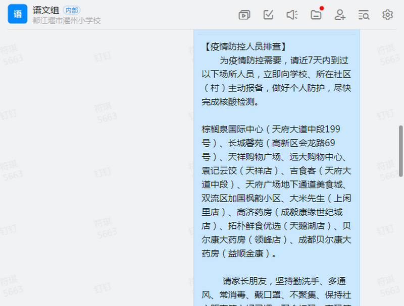 春季是传染病的高发季节,目前还有新冠疫情与常见春季呼吸道传染病流行是近期的风险,奥米克戎病毒全球肆虐,国内疫情多点散发,成都市也出现多处中风险区。为有效阻击疫情传播,都江堰市灌州小学校全体师生在教育局等相关部门的指挥下齐心抗疫,落实学校主体责任,把牢校园防控重点,层层落实压实防控责任,多措并举,确保师生健康安全。 Spring is the season of high incidence of infectious diseases. At present, there is still a near-term risk of the new crown epidemic and the epidemic of common spring respiratory infectious diseases. The domestic epidemic spreads in many places, and there are also many medium-risk areas in Chengdu. In order to effectively prevent the spread of the epidemic, all teachers and students of Dujinagyan Guanzhou Primary School fought the epidemic together under the command of the Education Bureau and other relevant departments and took multiple measures to ensure the health and safety of teachers and students