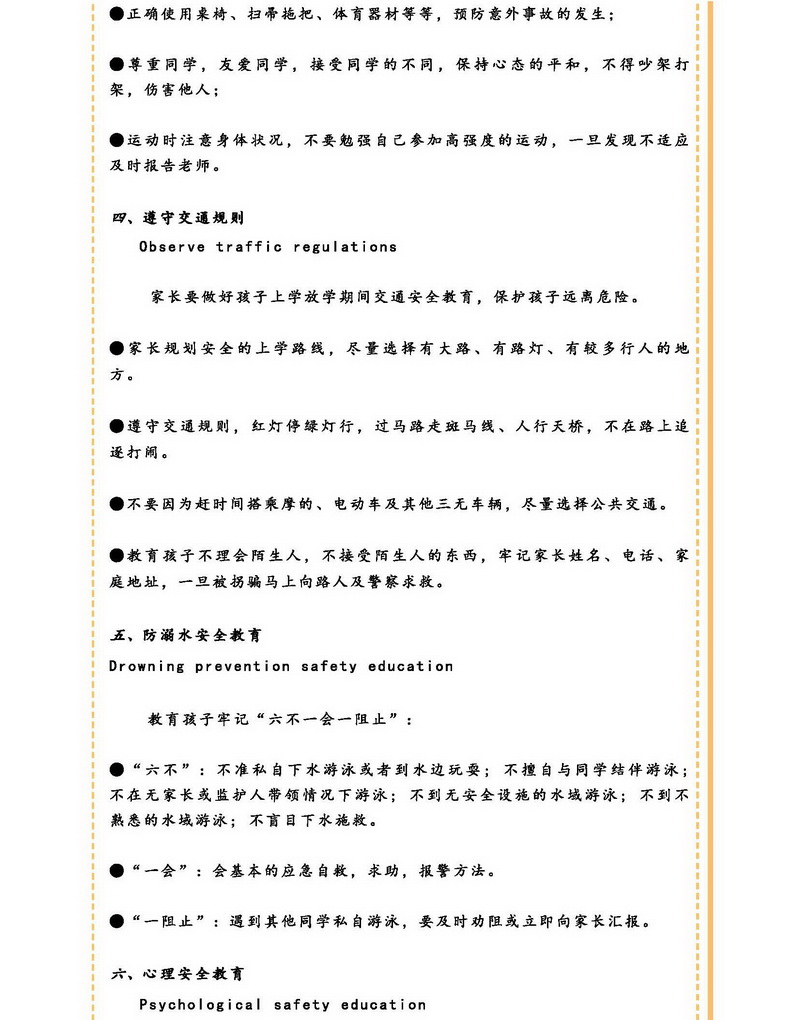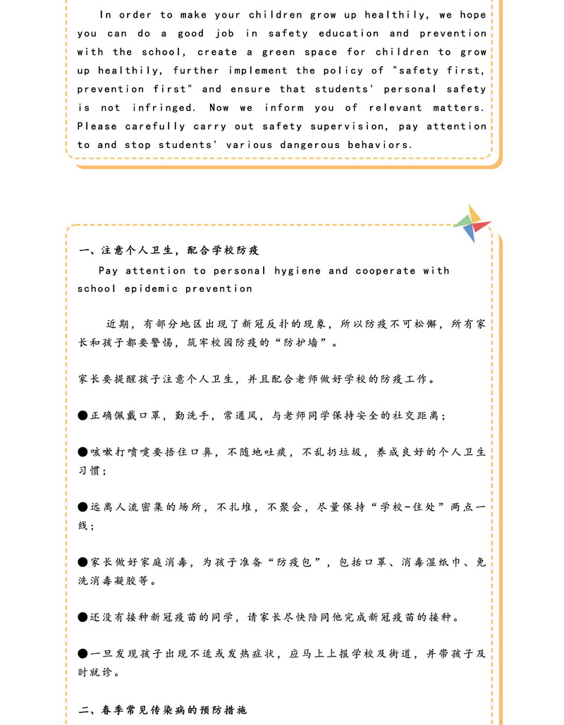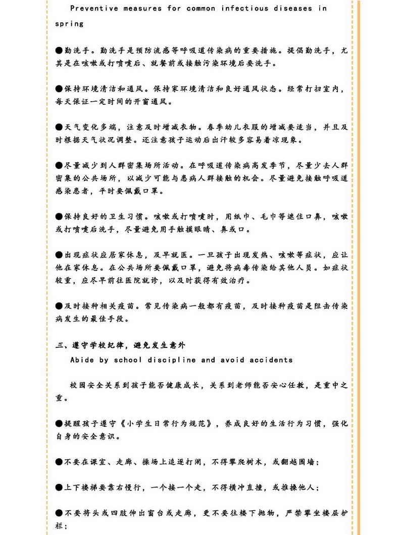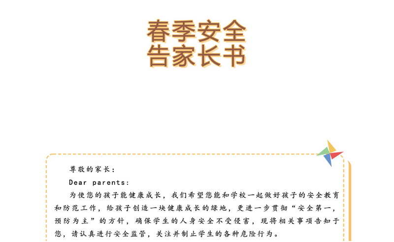 春季安全告家长书 Spring Safety Notice to Parents