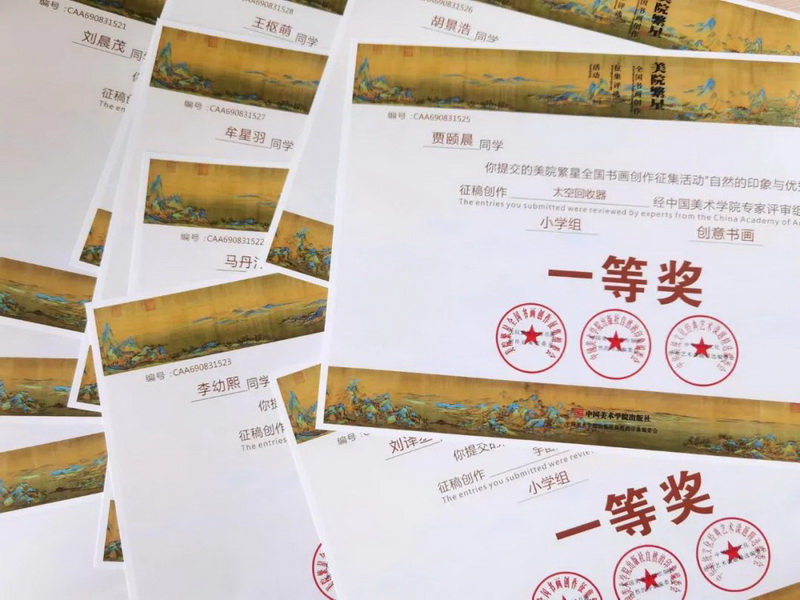 In the academy of Fine Arts stars national painting and calligraphy creation collection activities,the first prize winners are: Hu Jinghao, Liu Yicheng, Li Youxi, Jia Yichen, Mou Xingyu, Liu Chenmao, Chen Junan; The second prize winners are: Wang Huimeng, Zeng Ziling, Cheng Huiyang, Ma Danyang